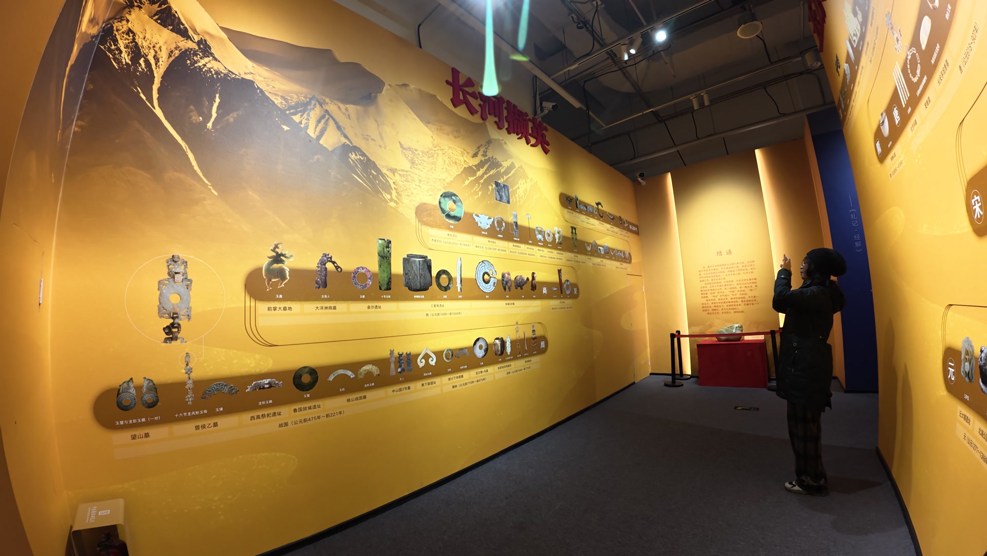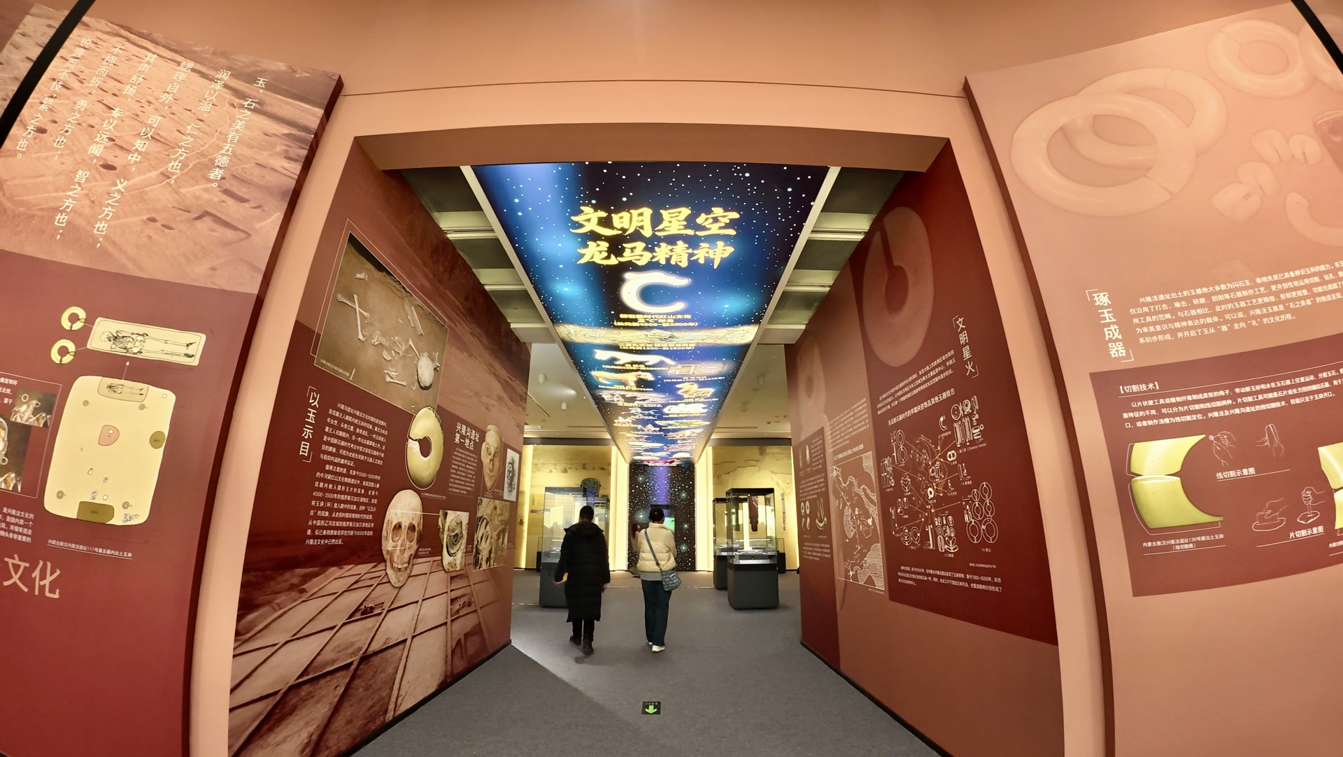 距今约8000年前的先民就已经开始了对玉器的琢磨。展览开篇,出土于内蒙古敖汉兴隆沟遗址的玉玦、玉匕、玉璜等集中亮相。这是中国目前所知年代最早的真玉器,将我国雕琢、使用玉器的年代上溯至新石器时代中期,见证了先民从“制石”迈向“琢玉”的关键跨越。循着天花板上的《文明星空·龙马精神》图文长卷步入展厅,“玉出东方”“玉见文明”“玉礼天下”“玉润中华”四大篇章铺展开来,以时间为序展现玉器在形制、功能与文化内涵上的变迁。