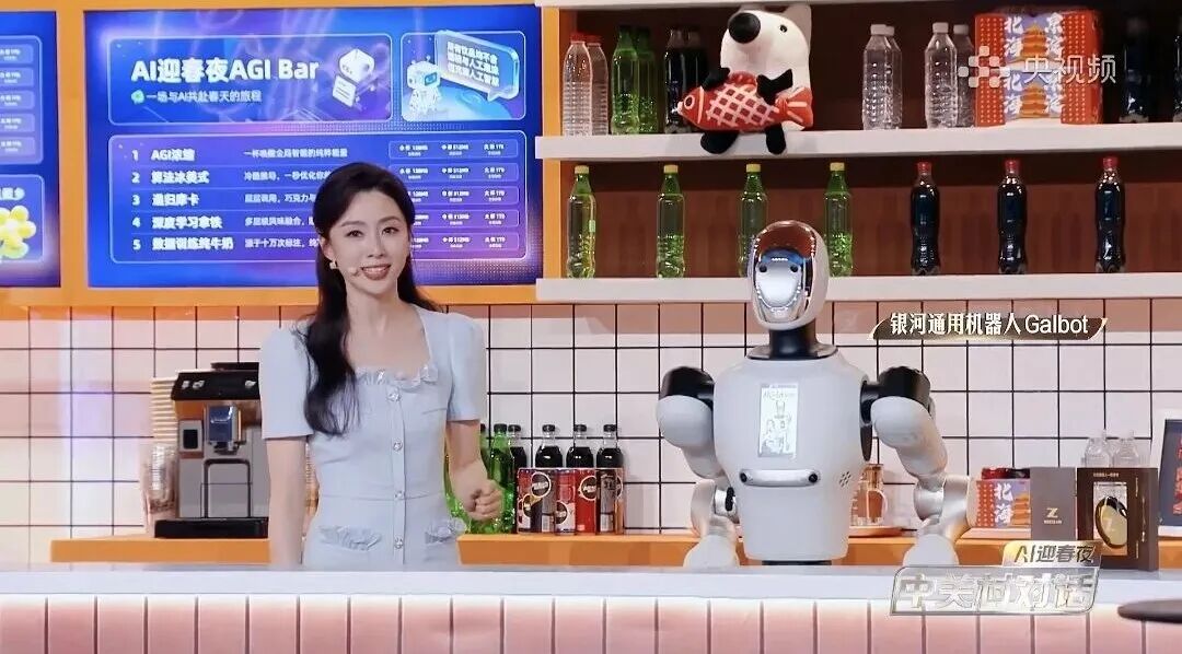 AI迎春夜上,一批海淀AI成果惊艳亮相。银河通用银河太空舱的机器人小Gal,从身后的货架上熟练地取下饮料递给顾客。星动纪元的机器人现场用毛笔写了一个“春”字,还不过瘾又当起了茶艺师,泡茶、倒茶。千寻智能机器人表演了插花的技艺,还串起了糖葫芦。