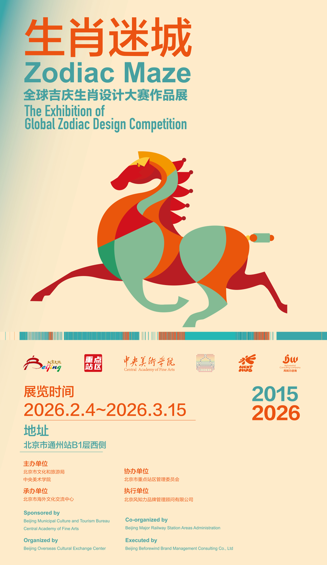 春临大地,福启新程。“生肖迷城——全球吉庆生肖设计大赛作品展”于2026年2月4日至3月15日在北京城市副中心重要交通节点——北京通州站展出。适逢春运期间,展览将为旅客与市民呈现一场汇聚全球创意、融合传统与现代的文化视觉盛宴。本次展览由北京市文化和旅游局主办,北京市海外文化交流中心承办,北京市重点站区管委会北京通州站地区管理办公室、北京城市副中心站综合枢纽建设管理有限公司协办。