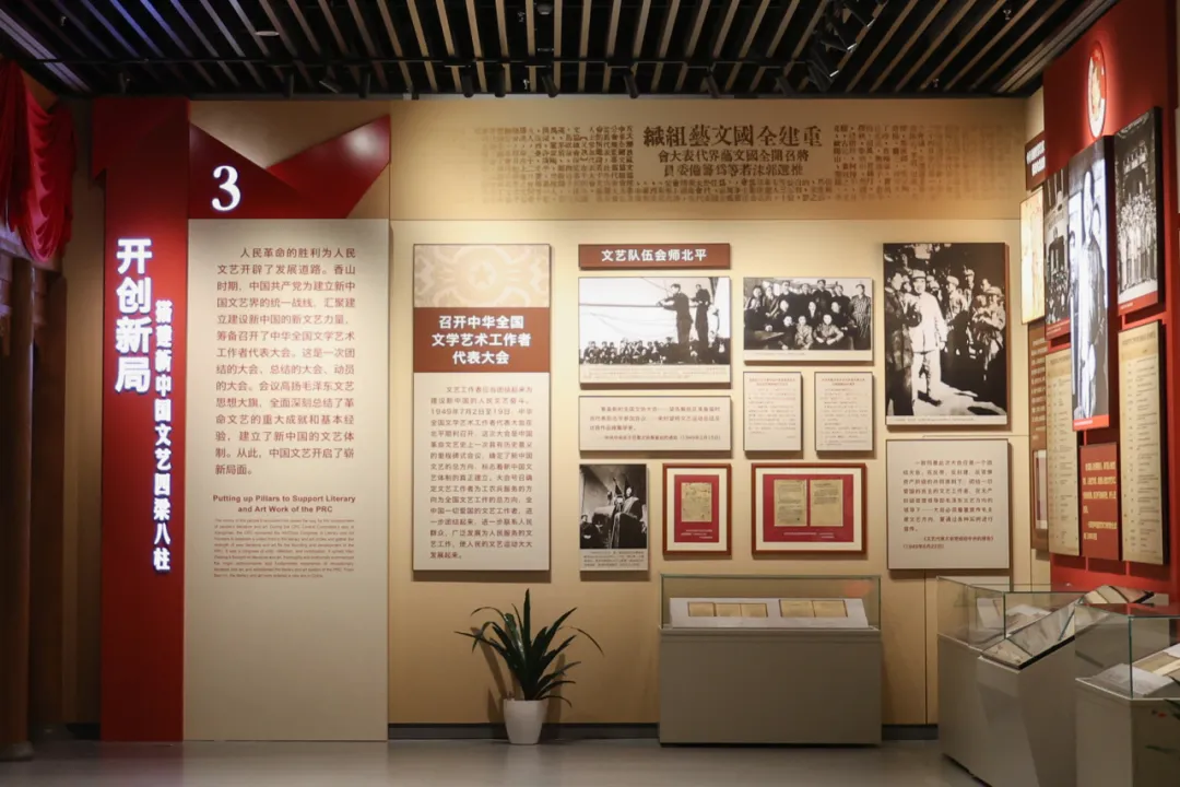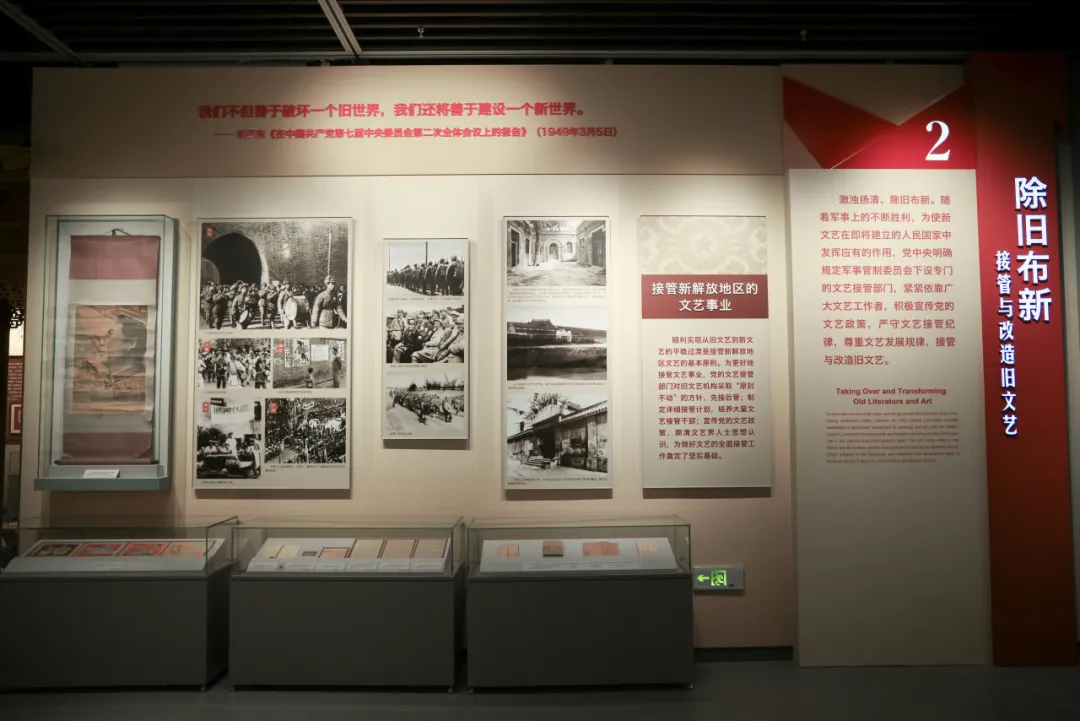 展览由序篇和4个部分组成:序篇;第一部分 文艺战鼓:为解放全中国鼓与呼;第二部分 除旧布新:接管与改造旧文艺;第三部分 开创新局:搭建新中国文艺四梁八柱;第四部分 精神火炬:书写生生不息的人民史诗。共展出照片200余张、珍贵文物文献360余件(套)。