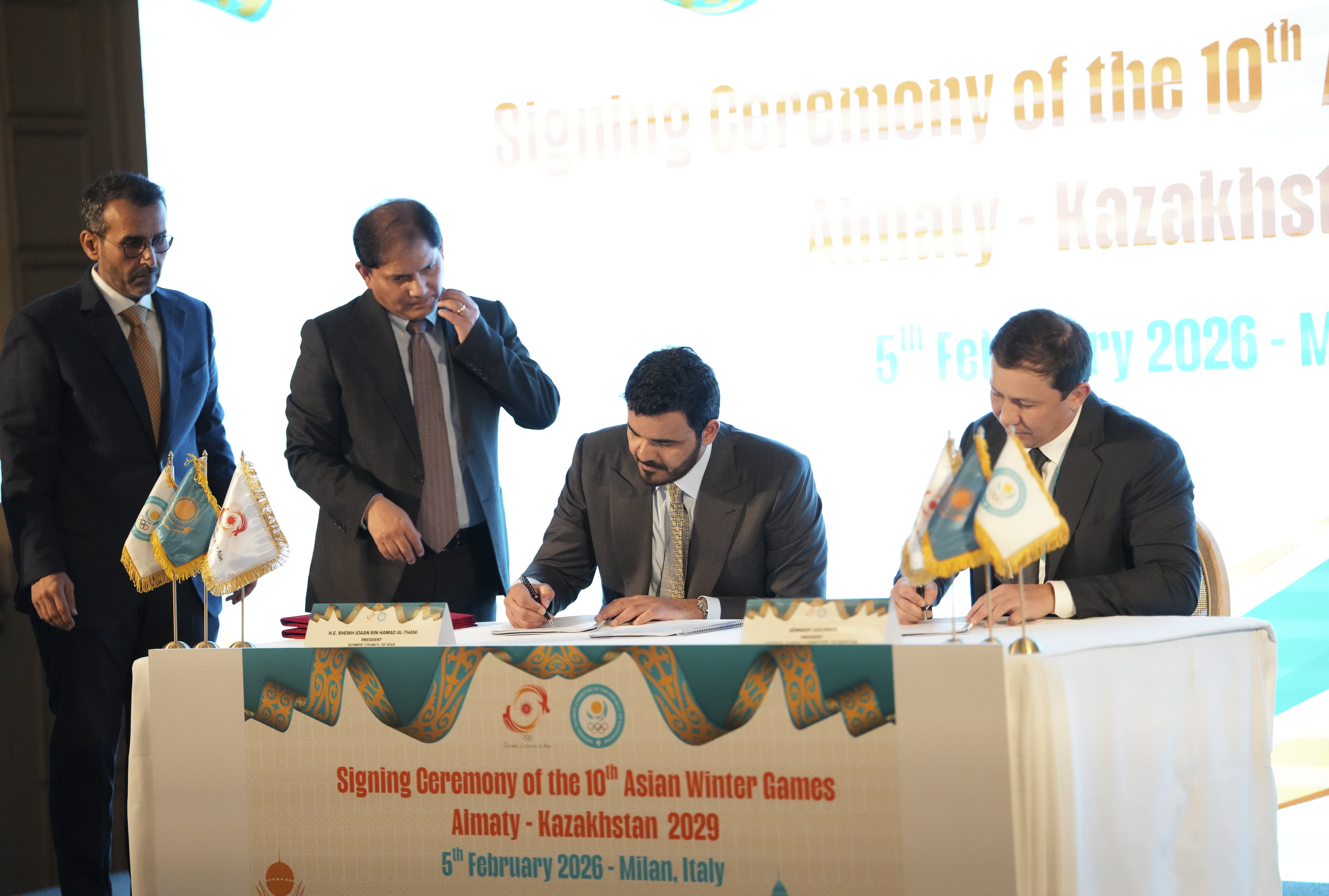 亚奥理事会主席谢赫·乔安·本·哈马德·阿勒萨尼与哈萨克斯坦奥委会秘书长阿利姆然·阿卡耶夫签署了举办城市协议。乔安·阿勒萨尼表示,亚冬会是加强各国家和地区奥委会之间合作与团结的重要平台,也符合亚奥理事会推动亚洲体育全面发展的愿景。他期待第10届亚冬会能够吸引亚洲各地的广泛参与,以提升亚洲在冬季运动领域的存在感,促进相关组织和技术体系持续发展。