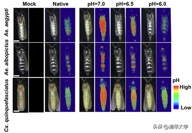 程功团队成员在进行蚊媒病毒其他方向的辅助数据测试时,偶然发现埃及伊蚊、白纹伊蚊、致倦库蚊等主要蚊子的血淋巴呈酸性环境 (pH 5.9-6.1)。这一发现打破了过往研究的惯性思路,因为蚊媒黄病毒颗粒在pH<6.5的条件下会迅速失活,失去感染能力。这表明蚊子虽然携带大量病毒,体内却没有适合病毒颗粒存活的环境。