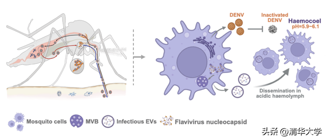 经过多轮的实验摸索与尝试,团队终于找到答案:蚊子体内真正的“传播载体”并非病毒颗粒,而是蚊子自身的细胞外囊泡(Extracellular vesicles,EVs)。它能将病毒的感染性物质包裹其中,隔绝酸性环境的“杀伤”,让病毒在蚊子体内留存,这也解开了蚊子无症状携带病毒的奥秘。