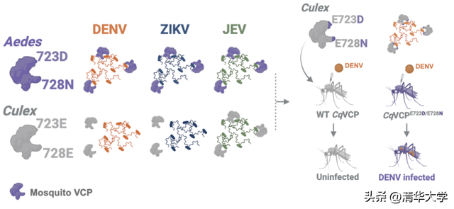 进一步研究发现,VCP上的两个氨基酸是介导VCP与病毒衣壳蛋白结合的关键氨基酸位点,不同蚊子的关键氨基酸位点差异是决定蚊子对不同病毒是否易感的分子开关。