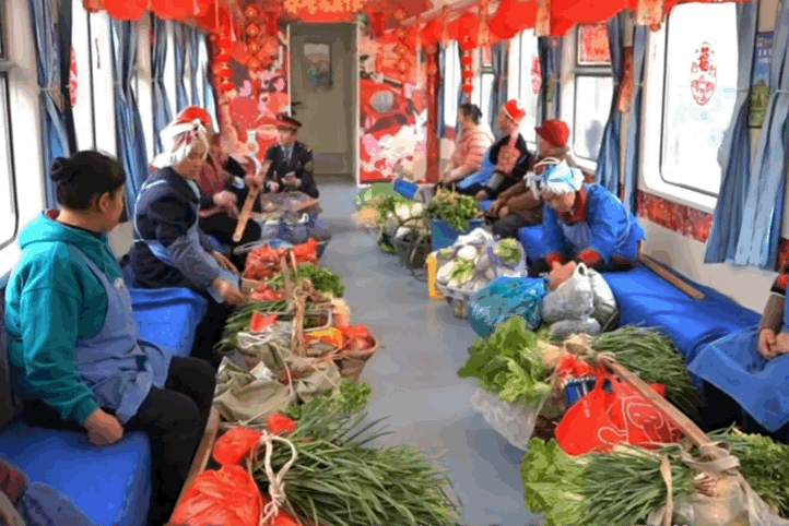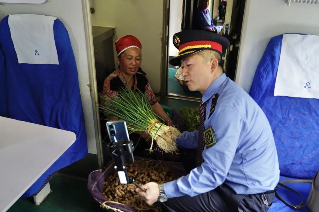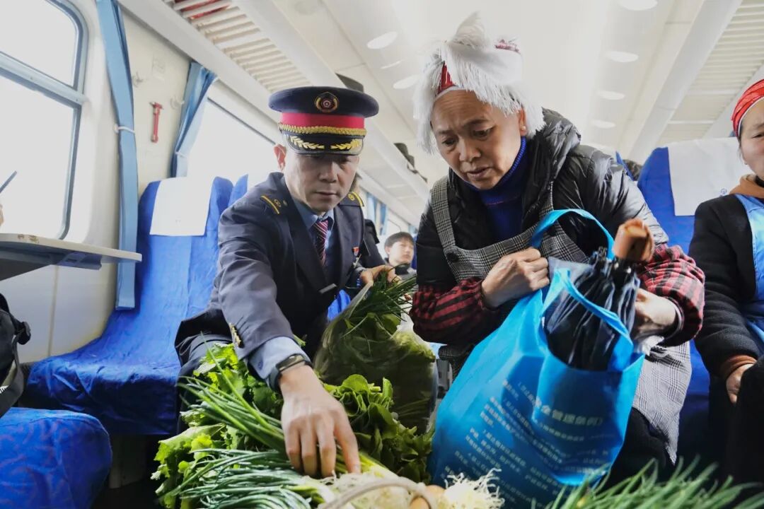 如今,老乡们背菜上车,列车员便拍照发到群里,标注好菜品和数量,城里老板在线接单。车到站时,菜农和老板在出站口交货,买卖便成了。这份“升级”不只是人数的增加,更是服务的走心:年轻菜农菜多,列车员就留电话提前找销路;客流高峰时,提前联系老板预留采购量;老人背不动菜,大伙便轮流搭把手。“冬天老乡凌晨就起床背菜,走山路赶车,有时一天才卖三四十块,能帮他们多挣二十块,就是实实在在的幸福。”胡贵川的话语朴素又诚恳。