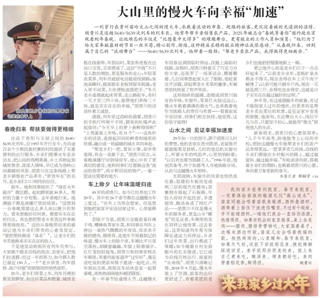 这些细碎的温暖,连缀成胡贵川独有的年味。车窗外,零星灯火掠过远山,慢火车载着满满的烟火气,也承载着他作为铁路人的责任与欢喜——看着旅客平安回家、同事们相互扶持,他觉得,这份坚守值得!