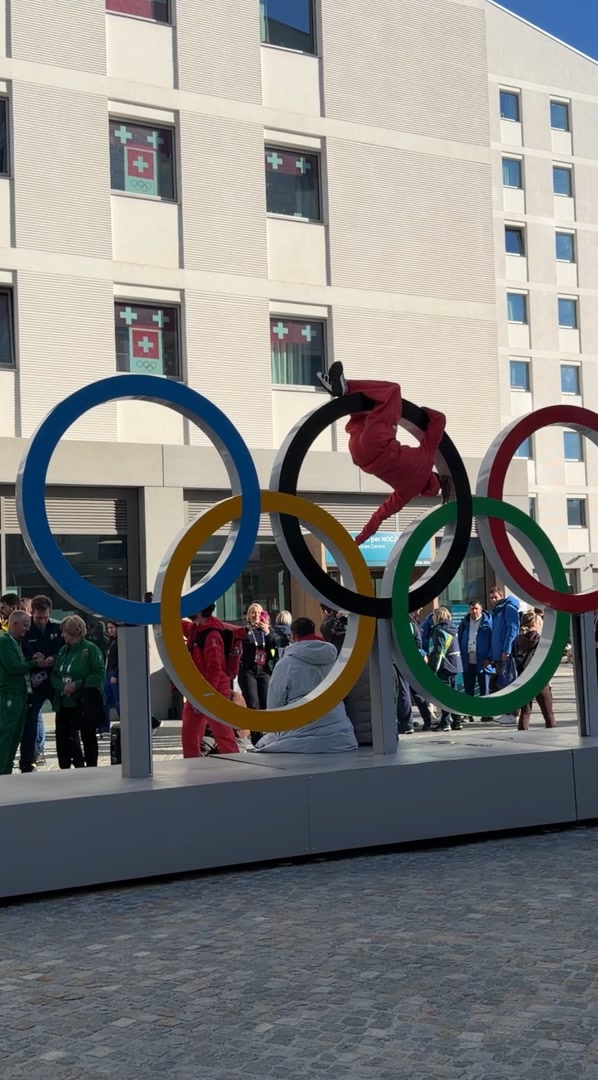 而小广场的旁边,就是村里最不可错过的打卡点——奥运五环标志。各队健儿在这里解锁了各种合影姿势,竖大拇指、伸展双臂属于循规蹈矩,坐在五环上也只能算“基操”,一位女将竟然像树懒一样四肢环抱着五环吊在上面。