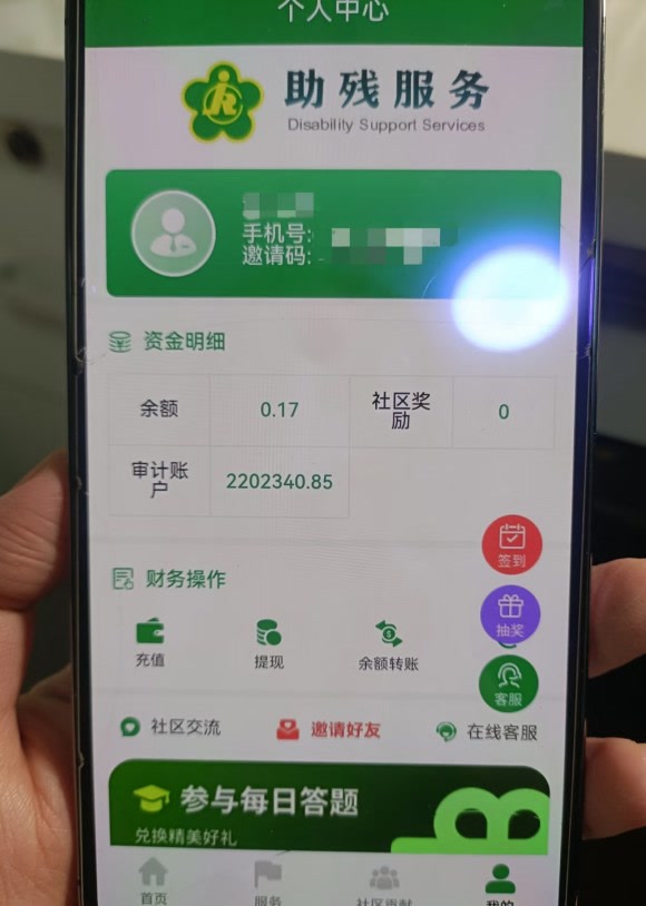 记者注意到,这个“助残服务”软件,页面不仅有资金明细,还有充值、提现、余额转账等操作模块。除了老人自己的投资信息之外,软件也设置了社区交流、邀请好友、每日答题兑换精美礼品等功能。该平台软件的坑骗逻辑是老人充值越多,平台“回报”的资金就越多。每邀请一个新成员,还有一万多元奖金。可一旦老人想提现,则需不断缴纳手续费、审计费等,所谓提现遥遥无期。目前,姥姥的“审计账户”显示金额已达220多万元,但张亚文并不知道老人在助残服务平台上到底投入了多少钱。姥姥只是对她说,再交两万多元就能提现,“其实根本无法提现,那个软件里的金额数字都是虚假的……”