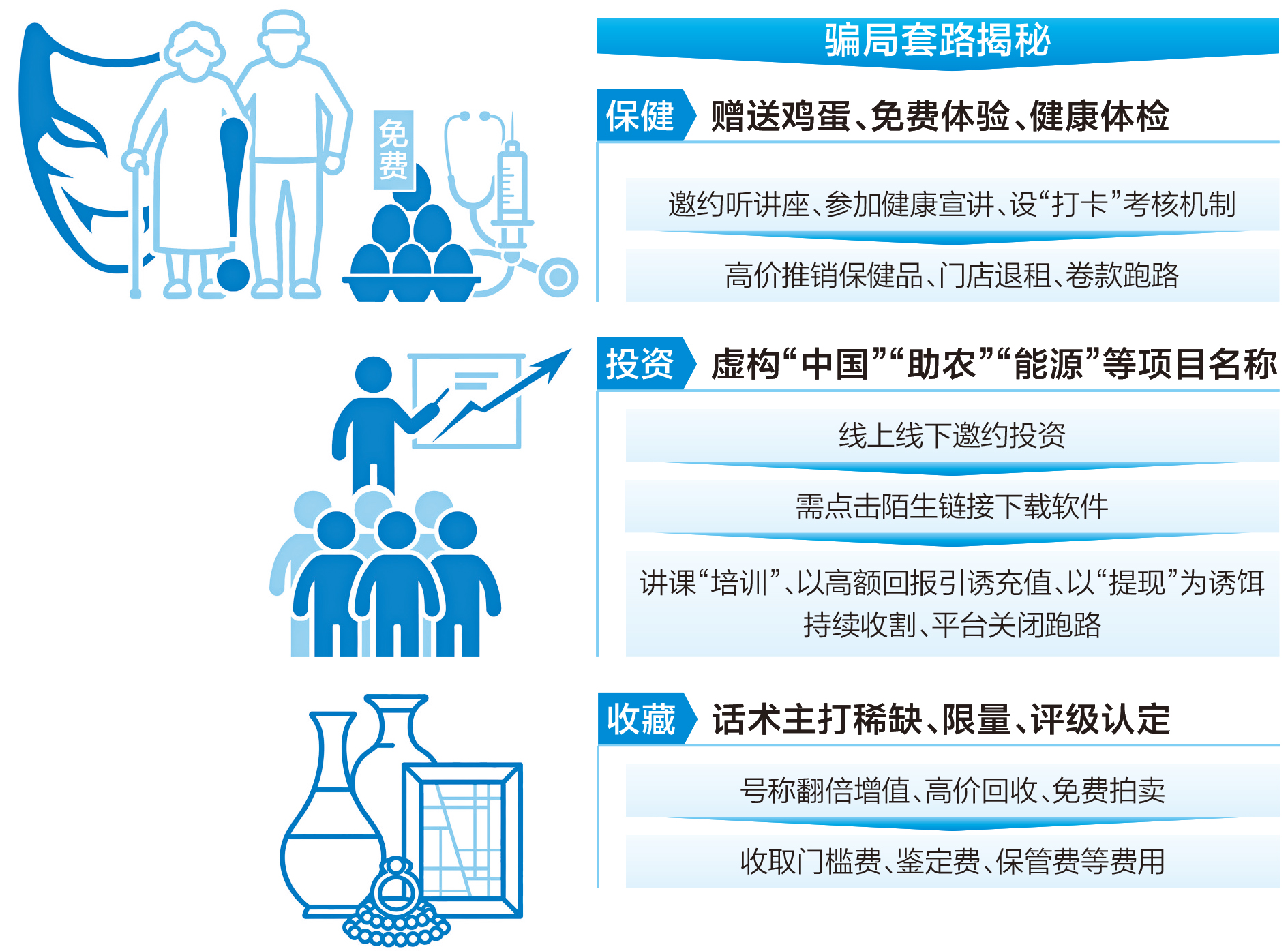 张霁野分析,老人之所以坠入种种套路骗局,除了相关人员手法多、圈套多,也与老人的生活状态和心理特质相关。例如,爱买保健品,是因为一些老人生活比较空虚且有健康焦虑;喜欢买收藏品,则因为老人有一定收藏爱好且幻想通过升值发财;花钱投资某个不靠谱的项目,也与一些老人有贪便宜心理、想给自己和儿女减负等原因相关。