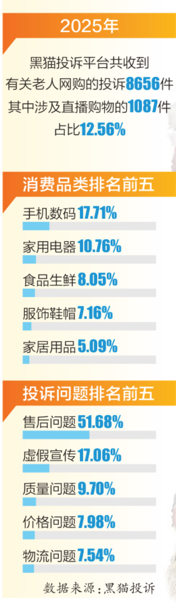 黑猫平台数据显示,2025年全年,在该平台老人群体投诉量前五名的消费品是手机数码、家用电器、食品生鲜、服饰鞋帽以及家居用品。其中,手机数码相关投诉达到17.71%。卢大爷希望,自己的遭遇和诉求能够引起重视,“网络直播带货不能成为法外之地,平台要承担责任,让造假售假者付出代价。”