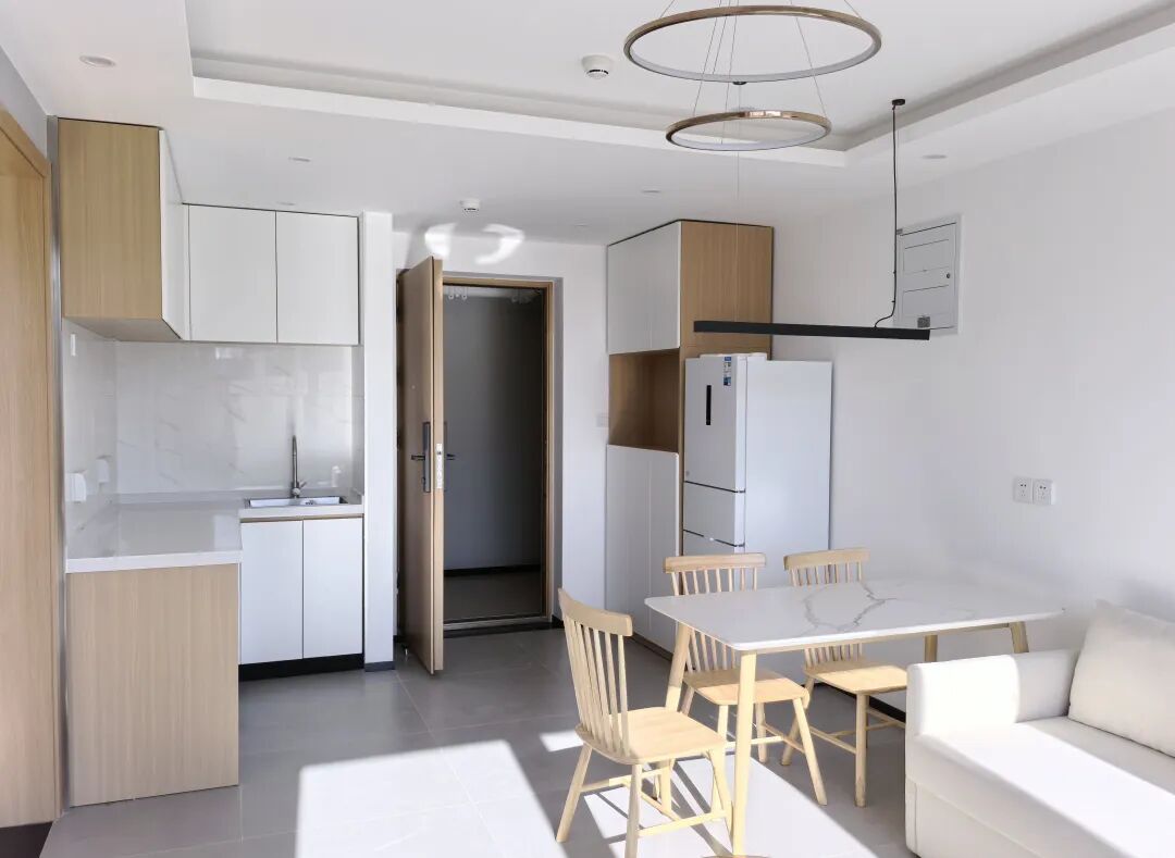 记者在现场探访看到,公寓房间采用现代简约装修风格,原木色家具搭配浅色系墙面,空间布局规整实用;品牌冰箱、洗衣机、空调等生活家电配置齐全。