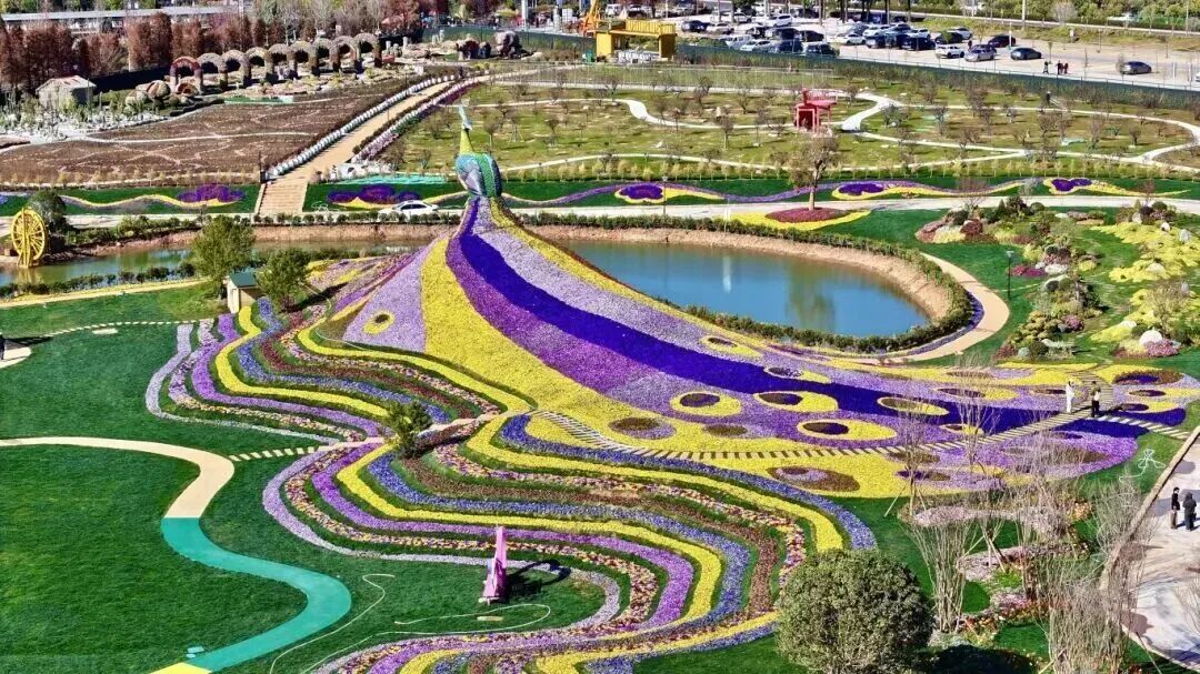 据悉,该园区打造突破传统平面花海模式,以“立体、沉浸、可互动”为核心,除巨型孔雀核心景观外,还布局了郁金香园、百花园等特色区域,近千平郁金香花海缤纷绽放,各色花卉错落排布,营造出步步皆景的沉浸式赏花体验,孔雀尾部的喷雾系统与夜间LED灯光设计,更让景观实现日夜双景的不同美感。
