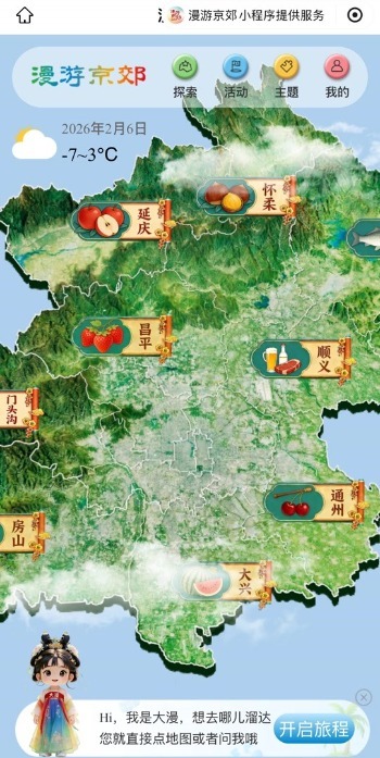 “漫游京郊”平台聚合农、文、旅、体、商多元业态,提供可视化地图、VR场景预览、AI智能行程定制、产品预订等功能。用户可通过平台轻松规划庙会、冰雪体验、民宿住宿等春节活动,还能生成个性化“春节路书”,实现线上线下无缝衔接。