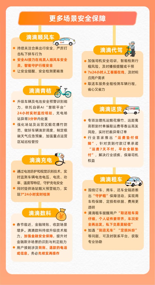 针对春运车流人流密集、扶老携幼、长距离跨城、夜间出行增多等风险特点,在夯实安全体系的基础上,滴滴也围绕重点场景加强守护。