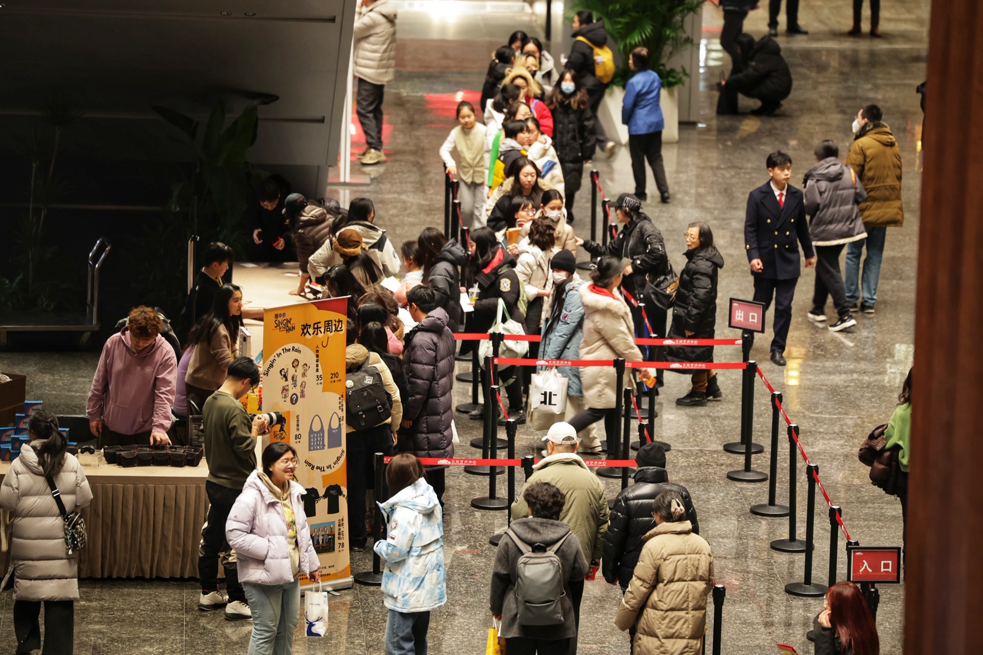 “坐接驳车往返一次,省下了将近100元的打车钱。”观众辛女士从四惠东站乘车,下车后再走几十米,剧场的检票口就在眼前,“比打车还方便。”夜色中,北京艺术中心流光溢彩,步入其间,《雨中曲》的元素充分融入文创、餐饮、打卡装置,与浓墨重彩的新春装饰交织出独特的热闹氛围。