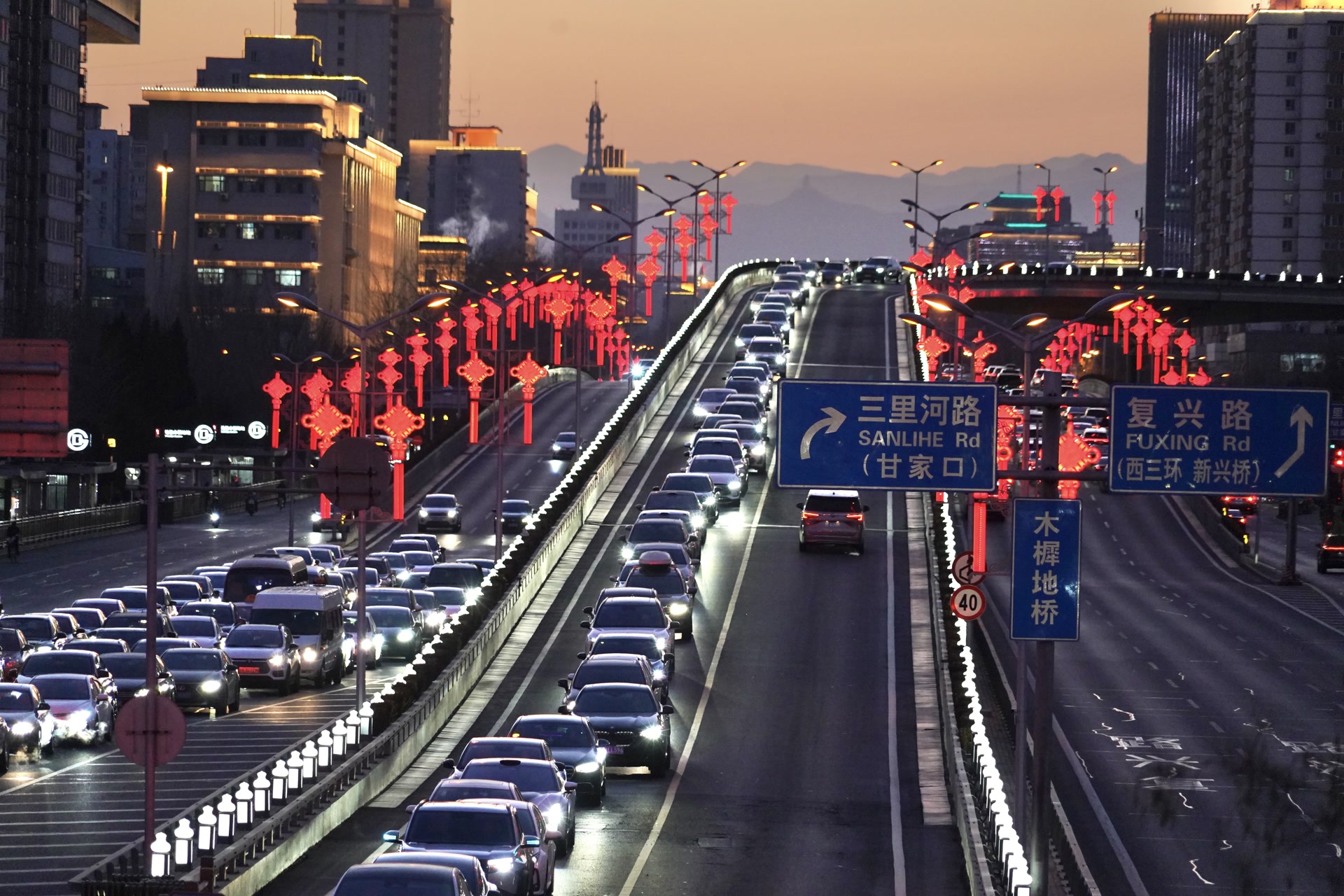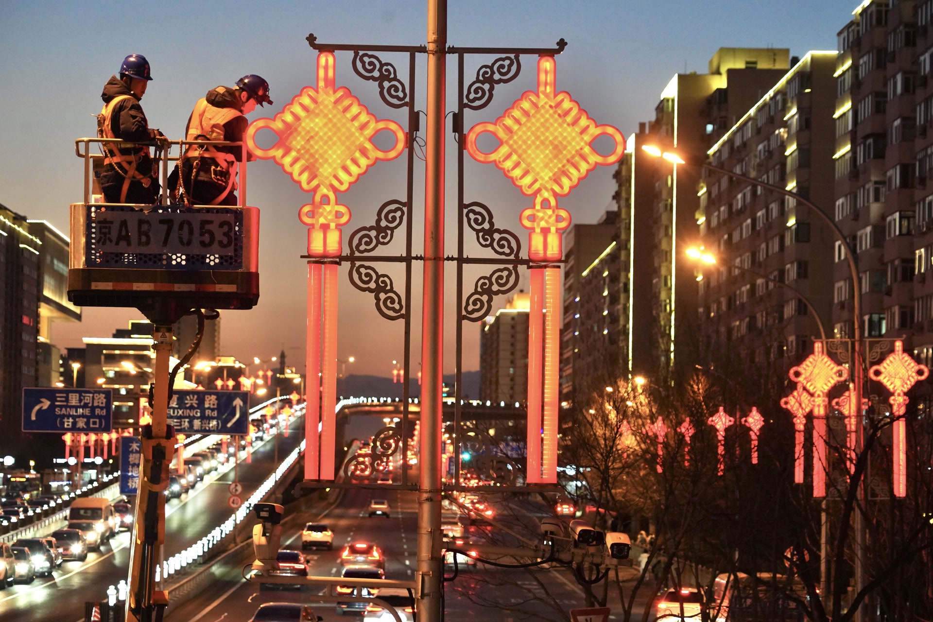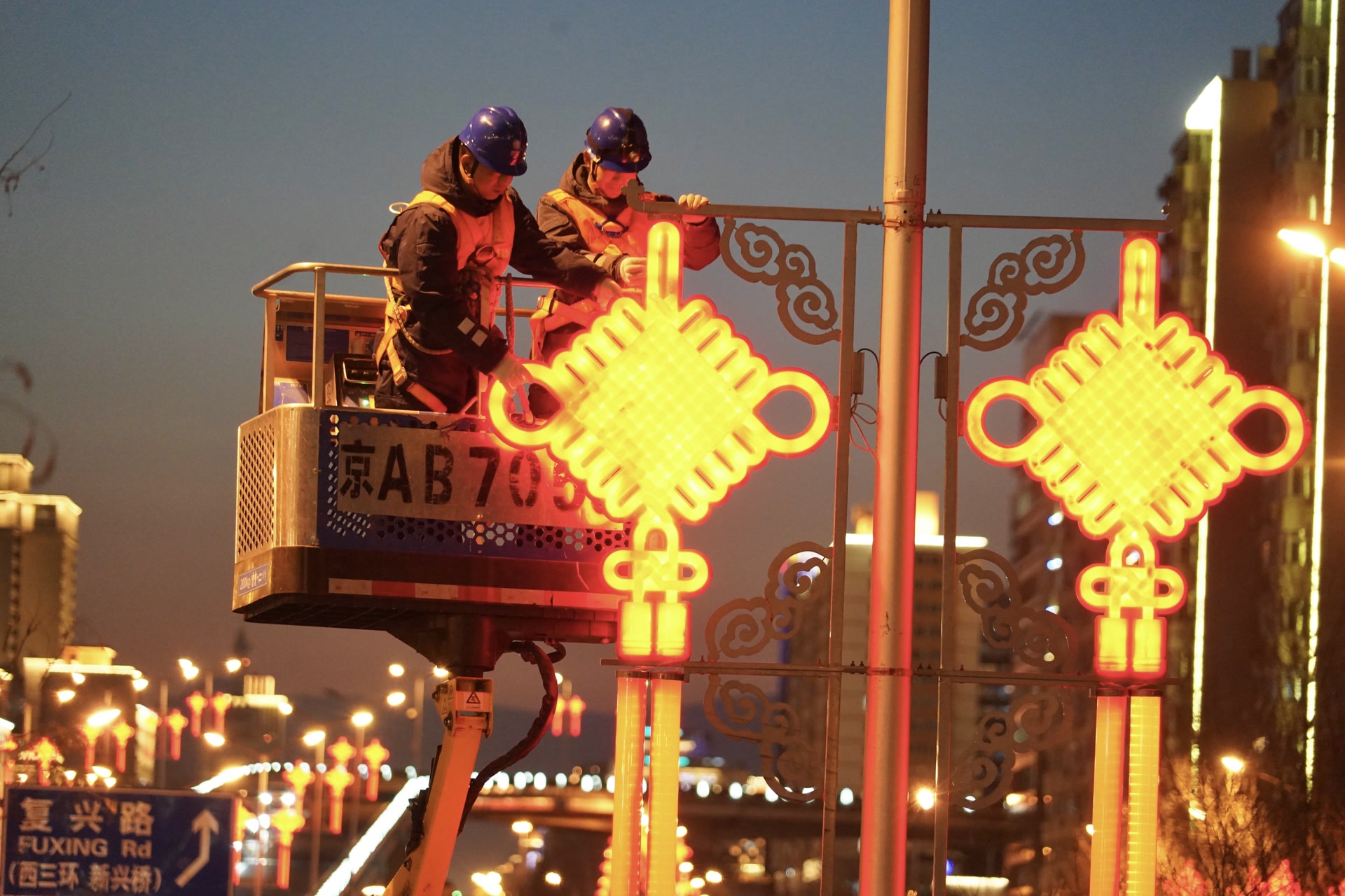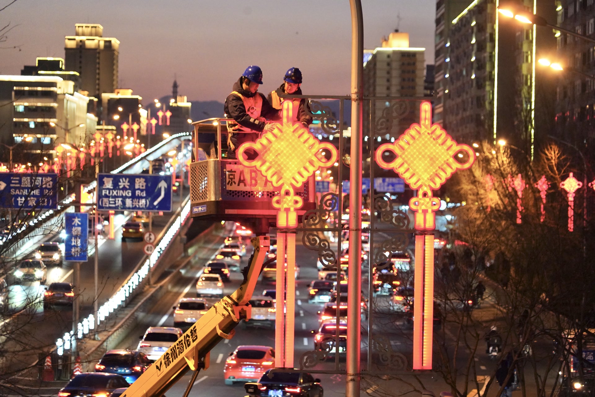 今天17时50分许,复外大街木樨地路段红色的中国结亮起了灯。黄建和同事驾驶着一辆高空作业车出发。黄建是国网北京电力城市照明管理中心运维检修二班的班长,他们负责二环内2.6万余盏路灯的运行维护工作,而每到春节前后,他们还额外增加了一项重要任务,就是要确保长安街两旁的大红灯笼和中国结始终正常工作,为京城增添浓浓年味。