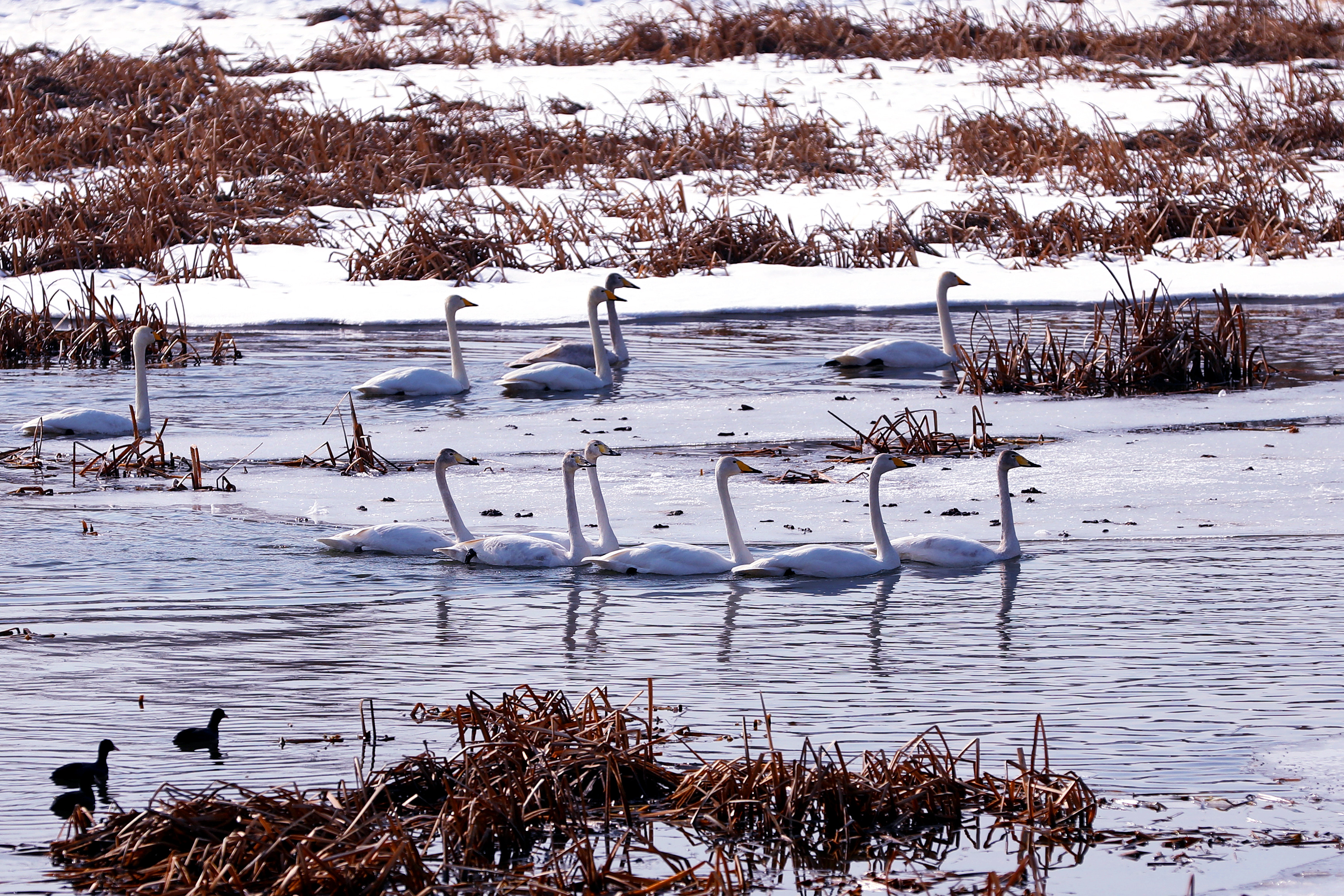 白天鹅被誉为生态环境的“晴雨表”。它们对栖息地的水质、食物、气候等条件有着极高要求,常栖息于开阔、洁净的浅水水域,以水生植物根茎及部分软体动物为食。