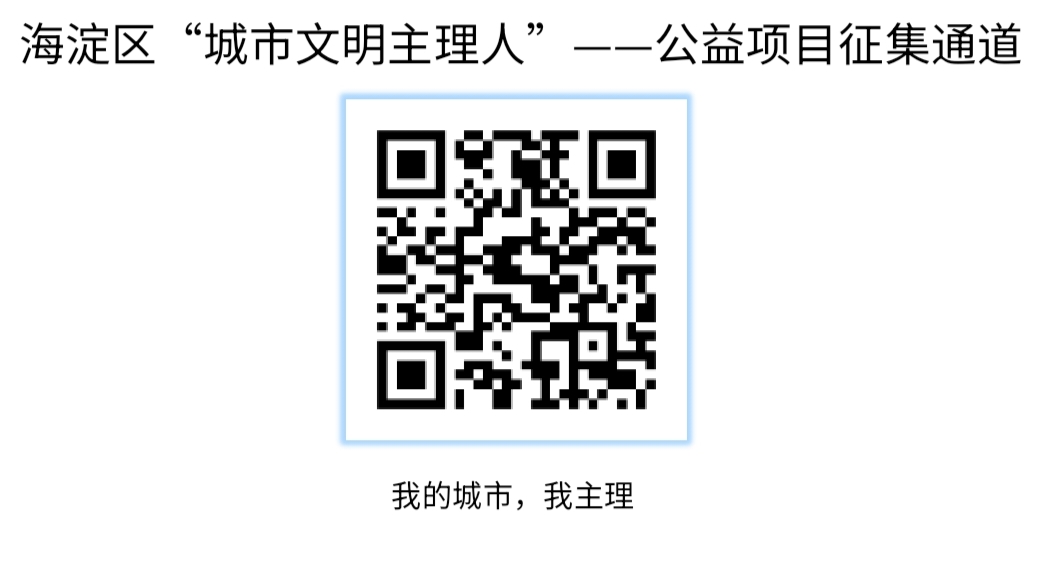 扫描“城市文明主理人——公益项目征集通道”二维码,就可提交自己的主理项目构想。对于其中具有创新性、可操作性和带动性的好项目,海淀区将主动联系并提供包括宣传推广、资源对接在内的系列支持,帮助主理人把想法落地、壮大,成为海淀城市文明风景线。