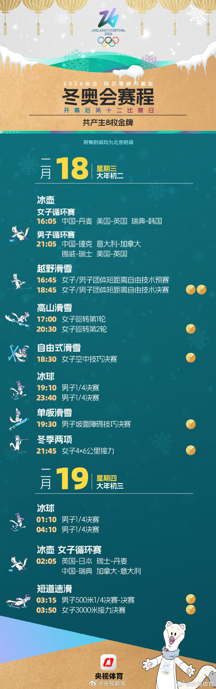 米兰冬奥会开幕、徐梦桃、谷爱凌、苏翊鸣、隋文静、韩聪、林孝埈、范可新、齐广璞、高亭宇、王诗玥、柳鑫宇、金博洋等126名中国冰雪健儿开启逐梦之旅!从2月7日到2月22日,冰壶、滑雪、速滑、冰球、花滑等精彩赛事将轮番上演,116枚金牌将陆续诞生。一起为冰雪健儿加油!