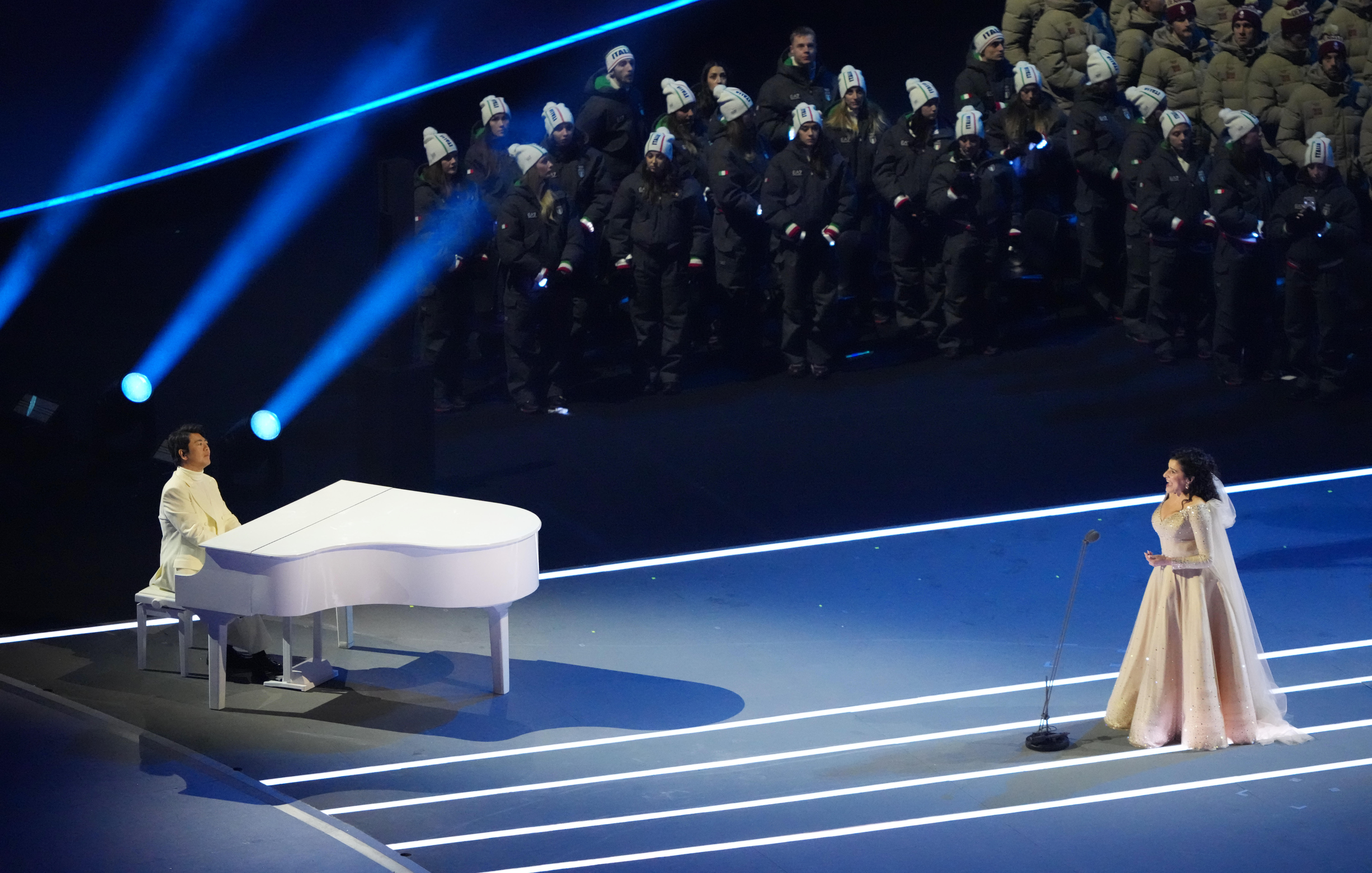 意大利国歌在两座主办城市同时响起,格莱美奖得主劳拉·普西妮在米兰演唱的同时,一支山区合唱团也在科尔蒂纳唱响《马梅利之歌》。两支歌声同时响起、同时结束,分毫不差,合为了一首。