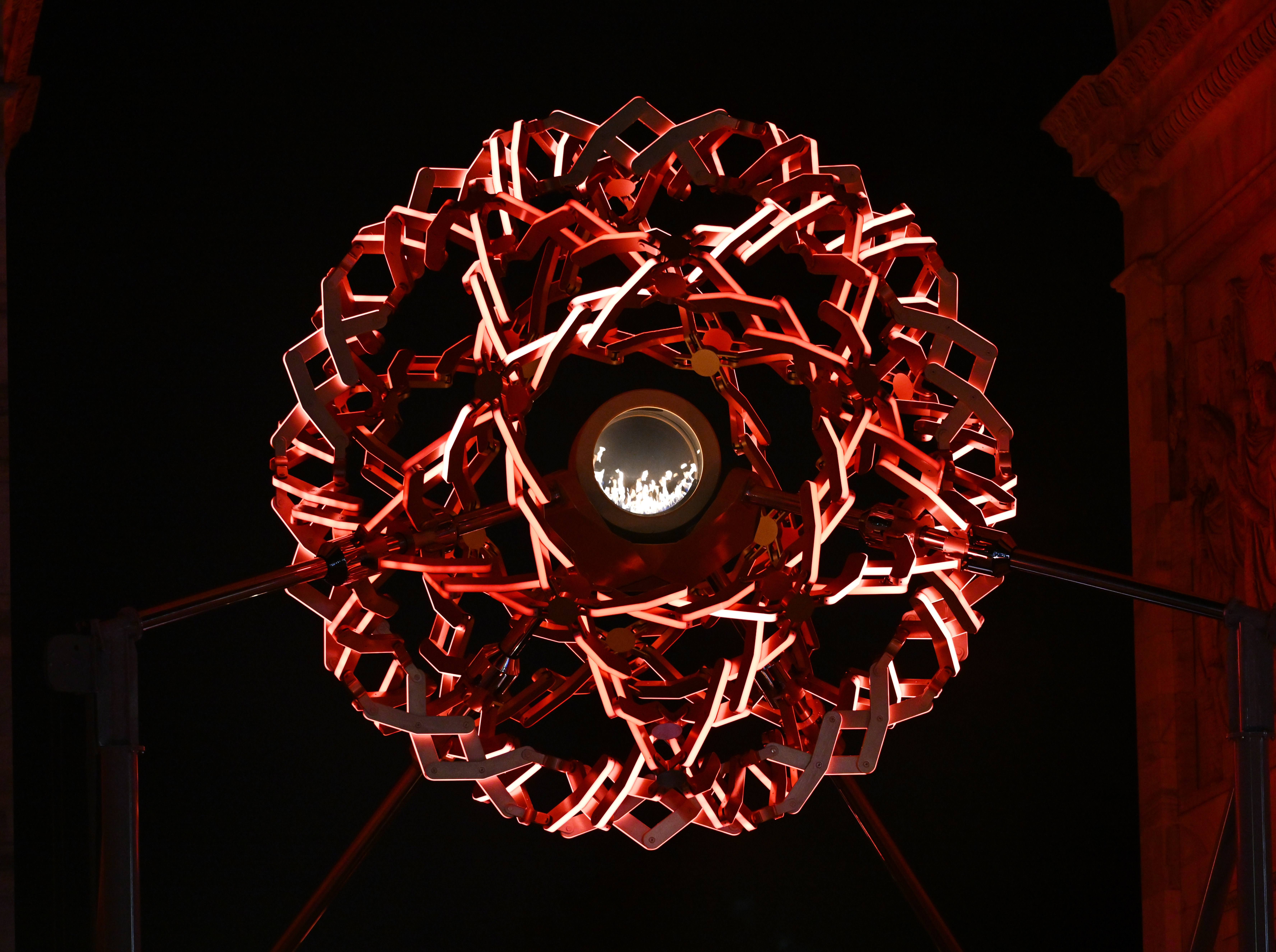 在米兰的和平拱门,在科尔蒂纳的迪博纳广场,两座同样的主火炬台同时被点燃。主火炬台的外观灵感来自意大利文艺复兴巨匠莱昂纳多·达·芬奇绘制的几何绳结图案,其结构采用可变几何设计,可实现动态开合,就像孩子们玩耍的“魔术伸缩球”。当被点燃的刹那,主火炬台表面呈现出阳光般的金色质感。