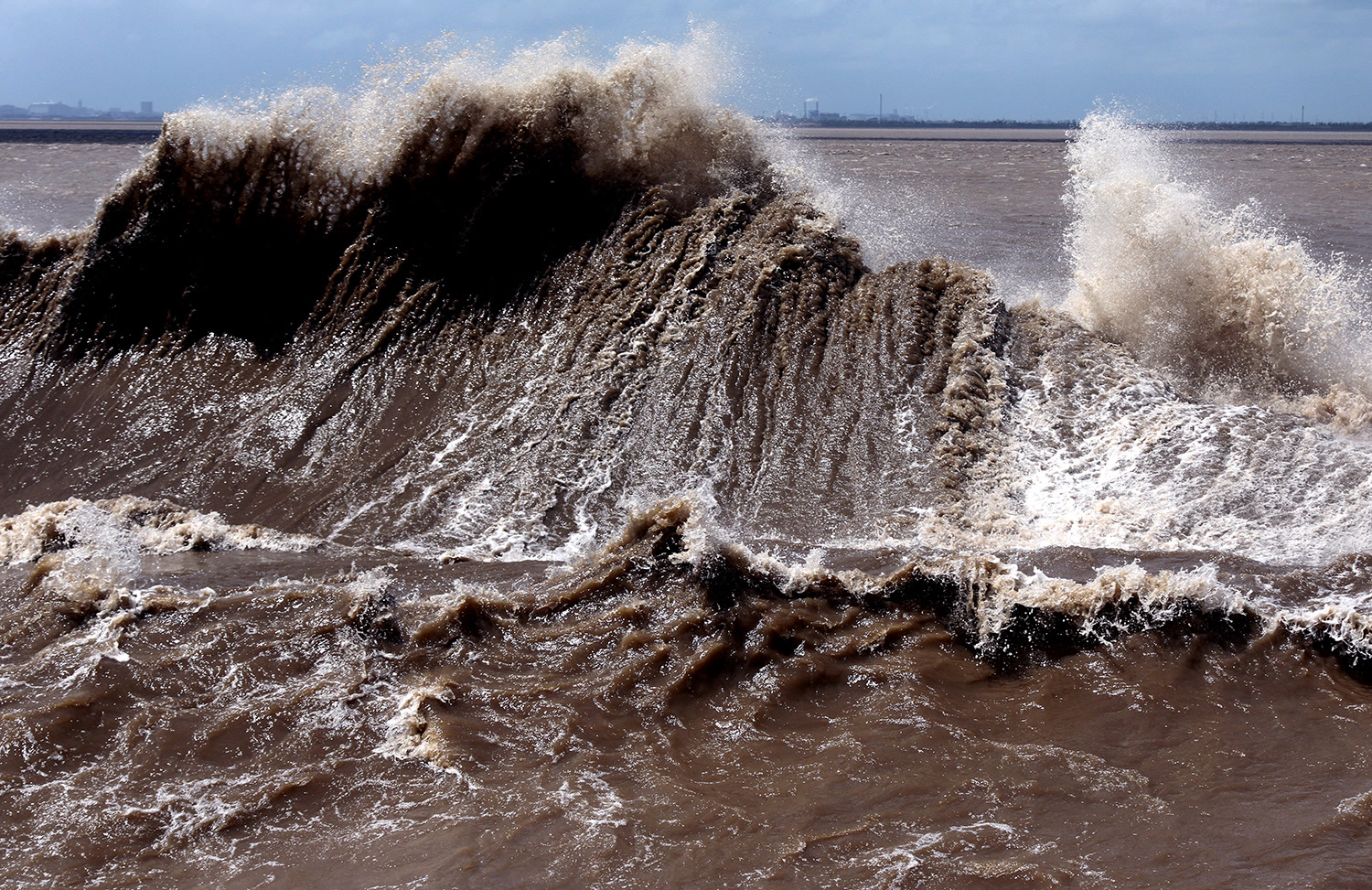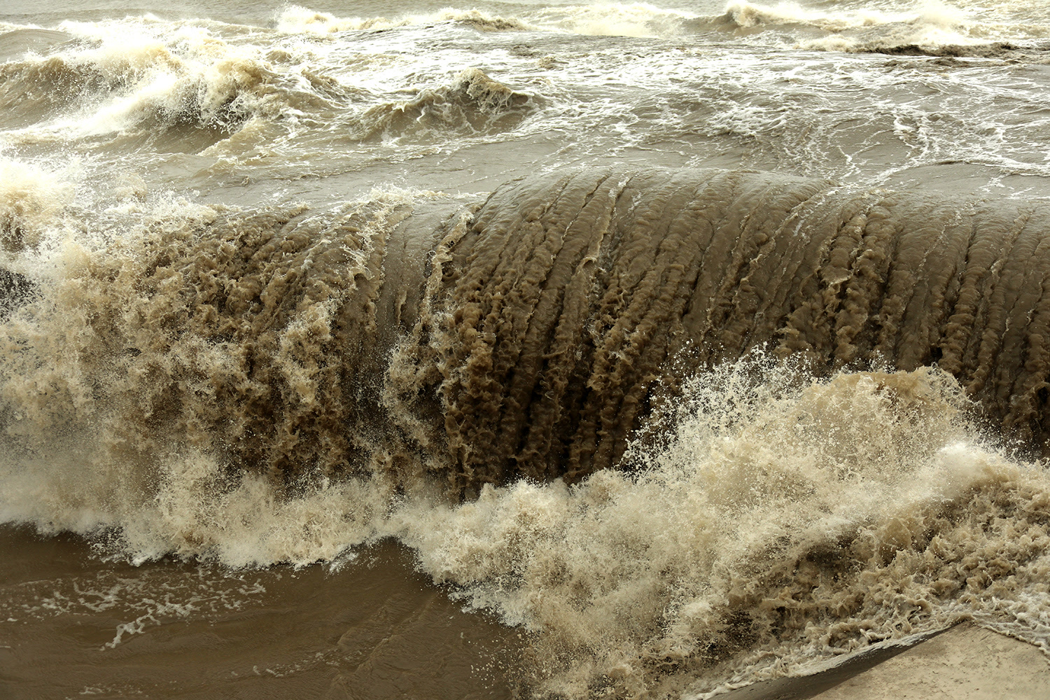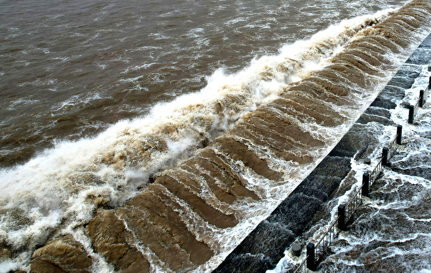 钱塘江涌潮前行的力量非常大,大潮汛期产生的强涌潮,对海塘冲击力每平方米高达7吨。