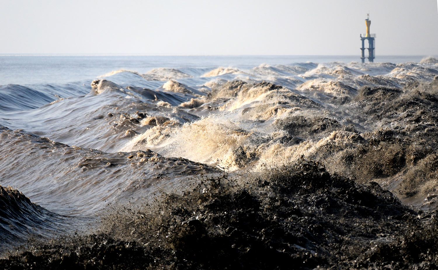 如果东潮先到,南潮迟来,东潮一往无前,就会产生由前往后强劲的“反射潮”。