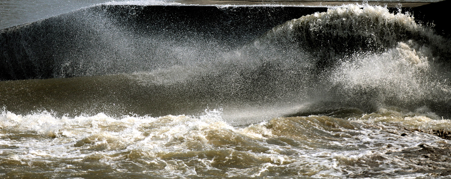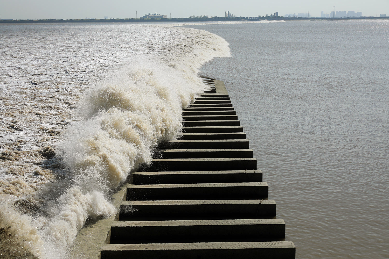 而从丁桥开始到老盐仓50多公里的海塘,在沿途几十个拦水丁字坝上,每次潮头冲击翻越过堤后,常常会有第二波甚至第三波潮水与第一波潮头形成的“反射潮”碰头,并形成新的更大的“反射潮”。