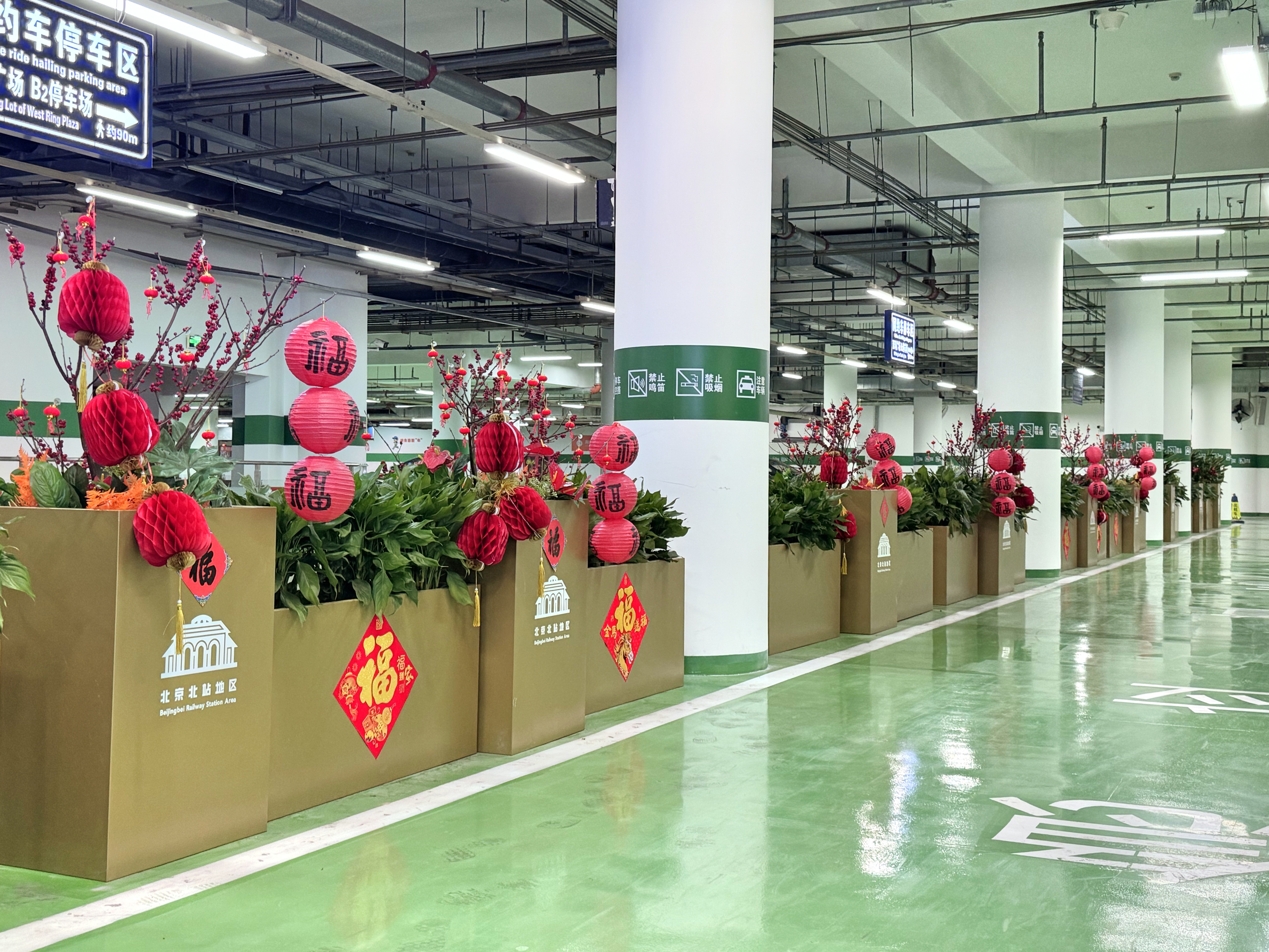 为了营造浓浓的年味儿,北京北站地区管理办公室在旅客等候区增添新年装扮,更新多彩植物,为花箱挂上红灯笼、贴上大红福字。