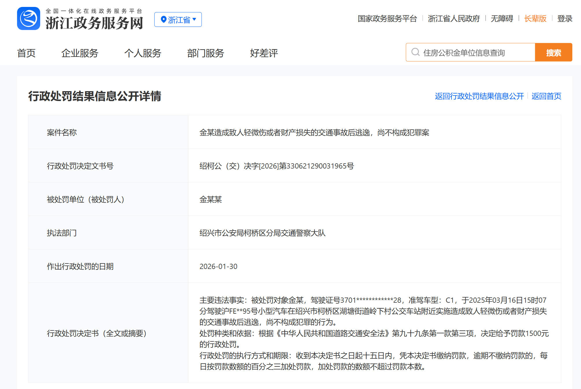 7日,在浙江政务服务网查询到金晨肇事逃逸事件处理结果:被处罚对象金某,驾驶证号3701************28,准驾车型:C1,于2025年03月16日15时07分驾驶沪FE**95号小型汽车在绍兴市柯桥区湖塘街道岭下村公交车站附近实施造成致人轻微伤或者财产损失的交通事故后逃逸,尚不构成犯罪的行为。