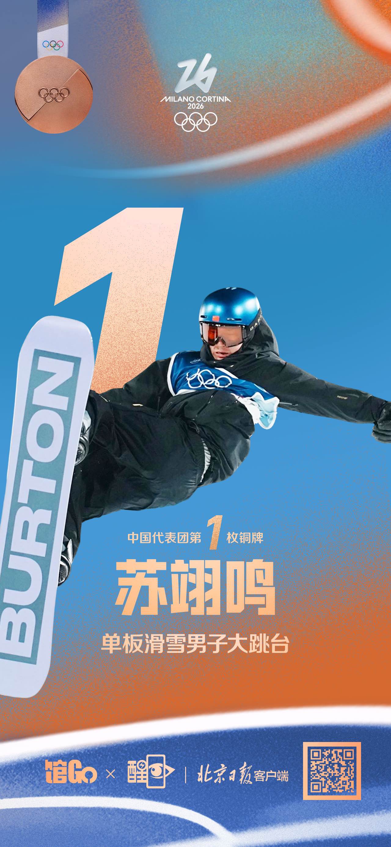 在冬奥会单板滑雪男子大跳台决赛中,中国的上届冠军苏翊鸣以总分168.50分夺铜,这是中国代表团本届赛事的首枚奖牌。苏翊鸣三跳都完成了1980,但第二和第三跳出现了手扶地的失误。两名日本选手分获金牌和银牌。苏翊鸣说,他已倾尽全力准备这场决战,因为毫无保留地拼搏过,所以不言遗憾。