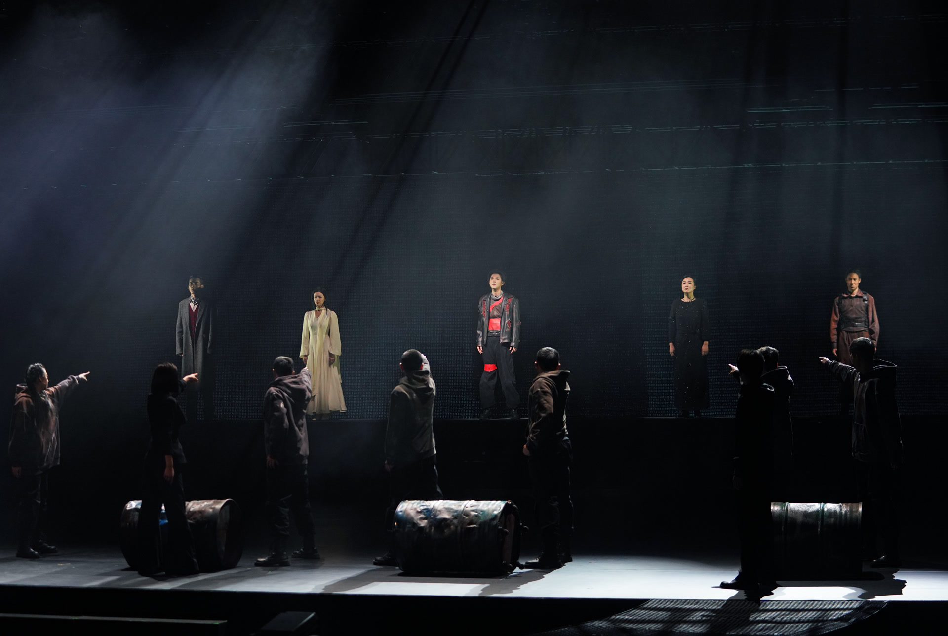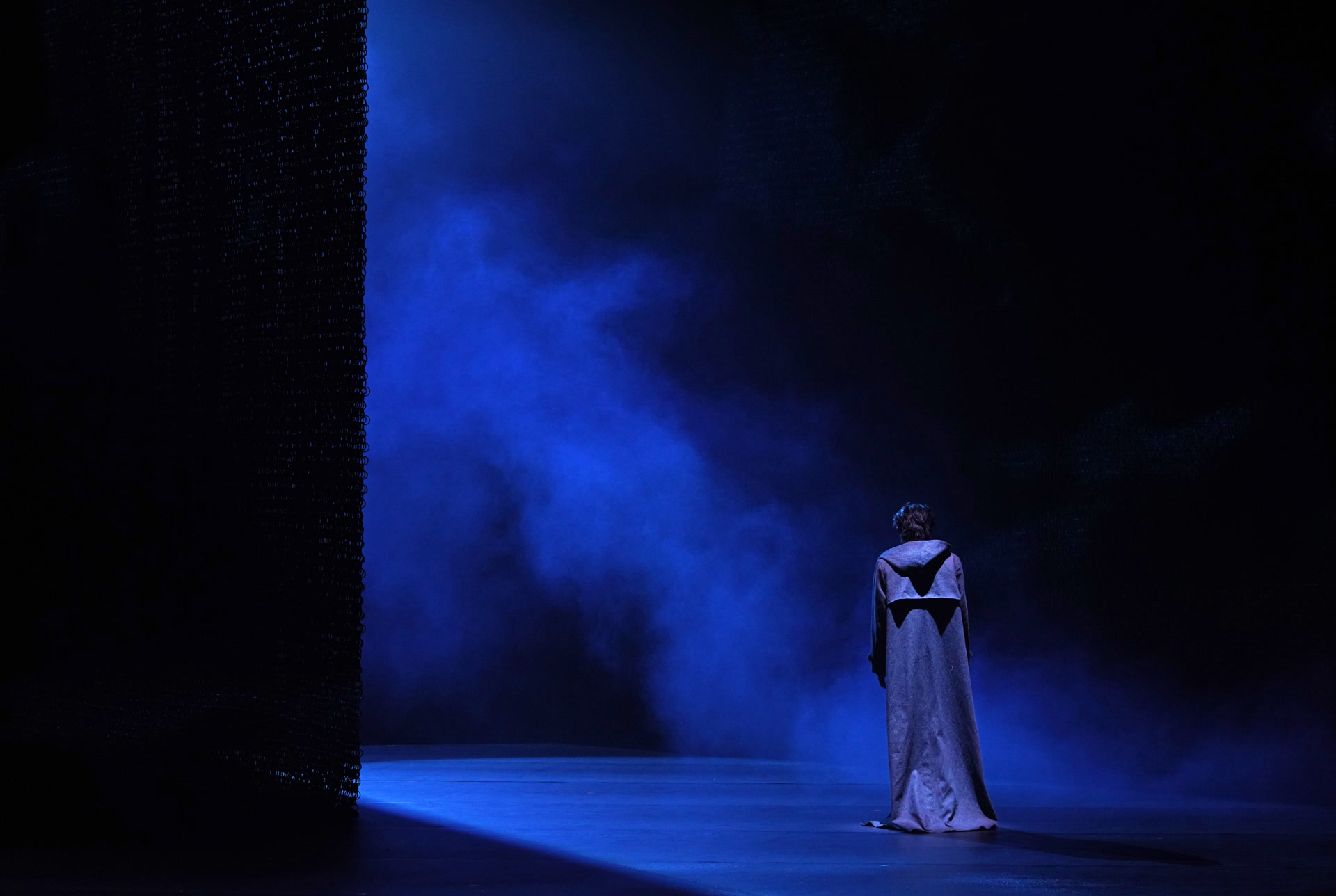 舞台中央那两幅巨大的、由机械操控的甲胄幕布,则是全剧的核心意象。舞美设计吴西周将铠甲极度夸张、符号化,使之成为可开阖、平移、旋转的命运之墙。在放逐一场中,幕布缓缓向科利奥兰纳斯迫近,物理空间被无情压缩,英雄被逼至舞台边缘,其精神世界的倾轧感扑面而来。而在与母亲伏伦妮娅劝和时,幕布几不可察的微妙旋转,映射着人物内心的动摇。幕布不仅是舞美,更是叙事本身,是人物情绪与命运的视觉化写照。