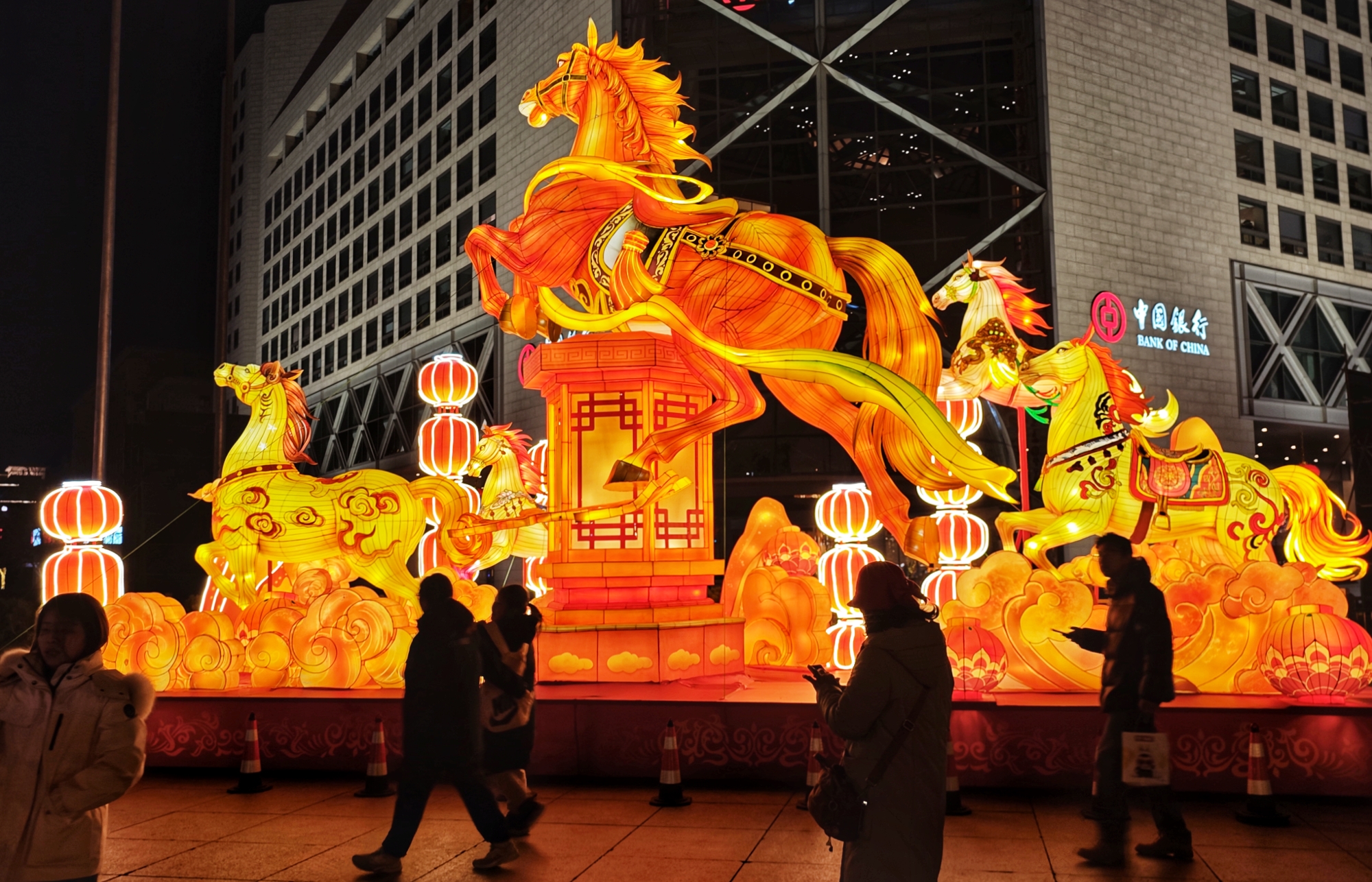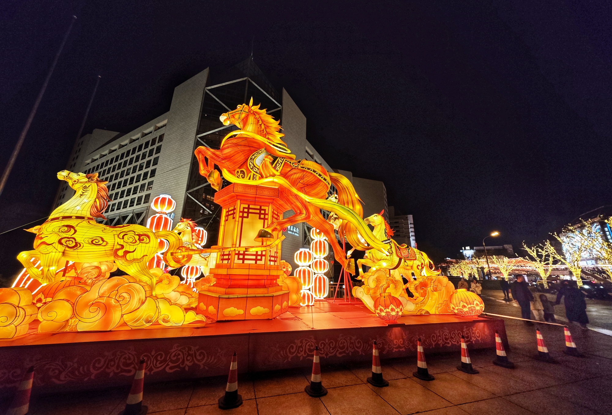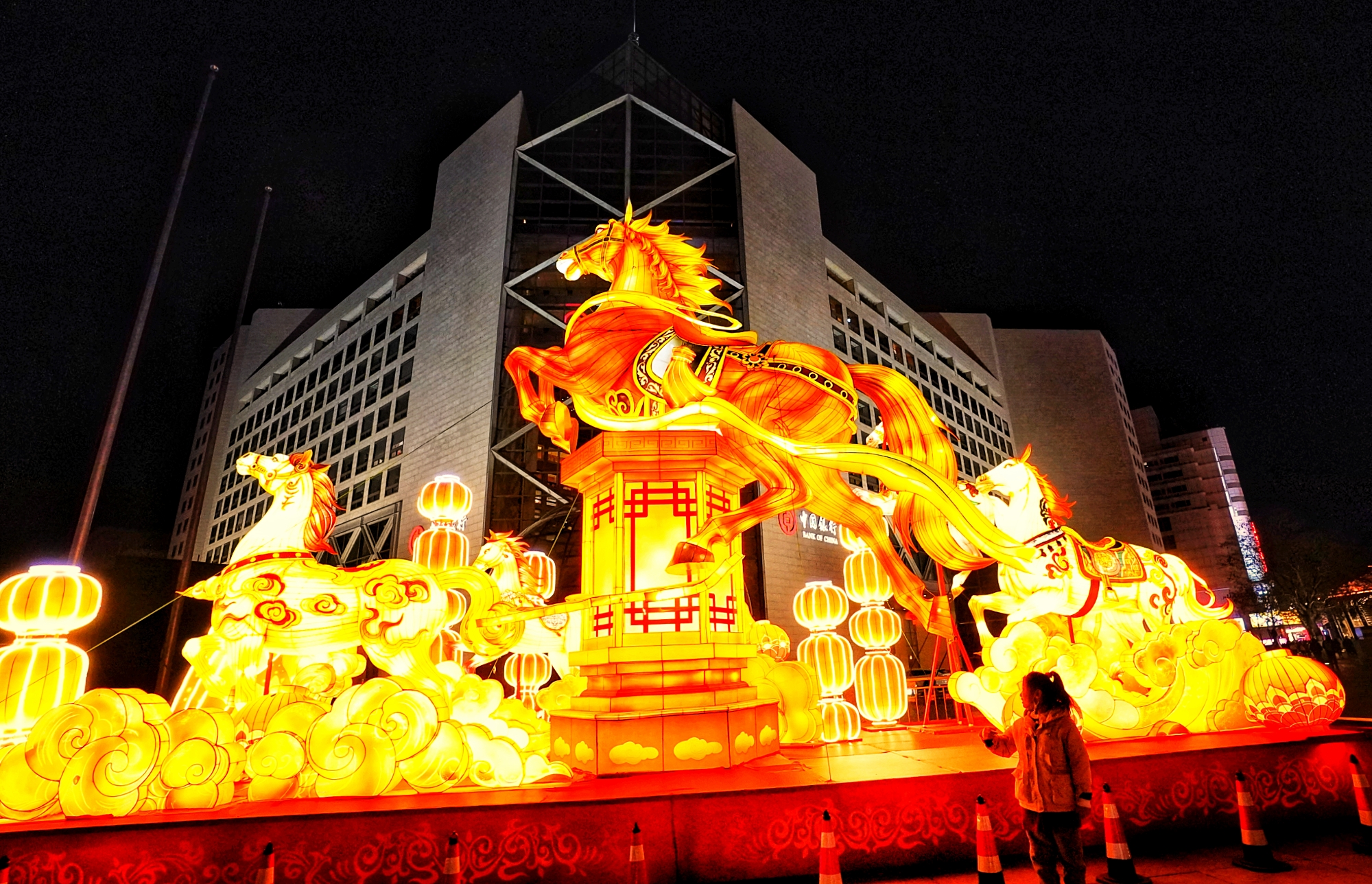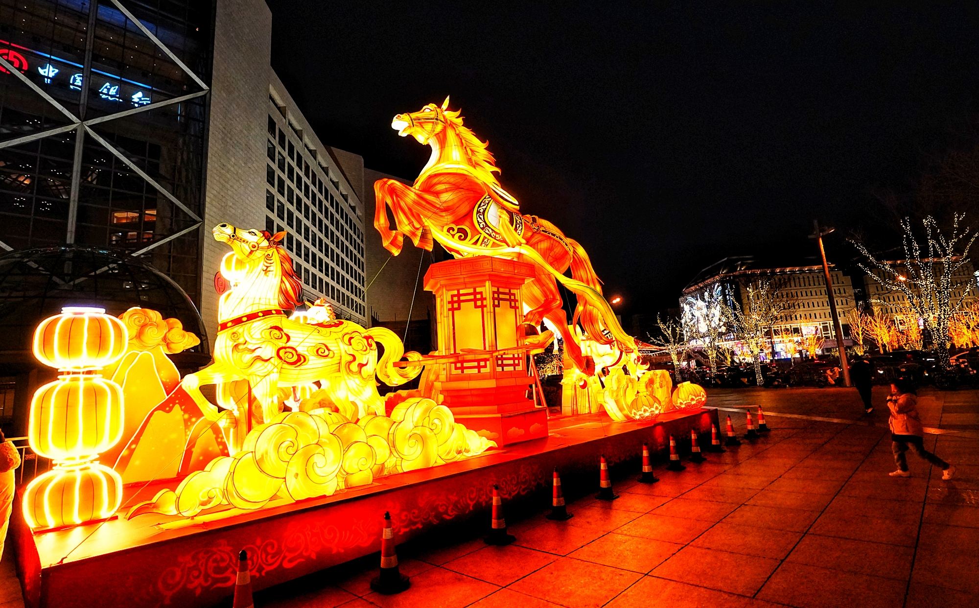 与之呼应的西单商业街“万马奔腾”灯组,同样注入自贡花灯的精湛工艺。灯组以“万马奔腾开胜境,春风浩荡展宏图”为精神内核,塑造出五匹姿态昂扬的骏马形象。采用现代公共艺术手法结合自贡传统扎制技艺,马匹肌理分明、身披金红华饰,主马昂首引领、两翼辅马呼应,形成强劲视觉动势;马匹关节处暗藏的动态机关,让灯组在夜色中呈现出栩栩如生的奔腾之态。底座环绕的层叠祥云纹与赤色灯笼阵列,将“马到成功”的传统吉祥寓意与“奋进不息、盛世昌隆”的时代气象相融,在夜色中勾勒出昂扬向上的精神图腾。