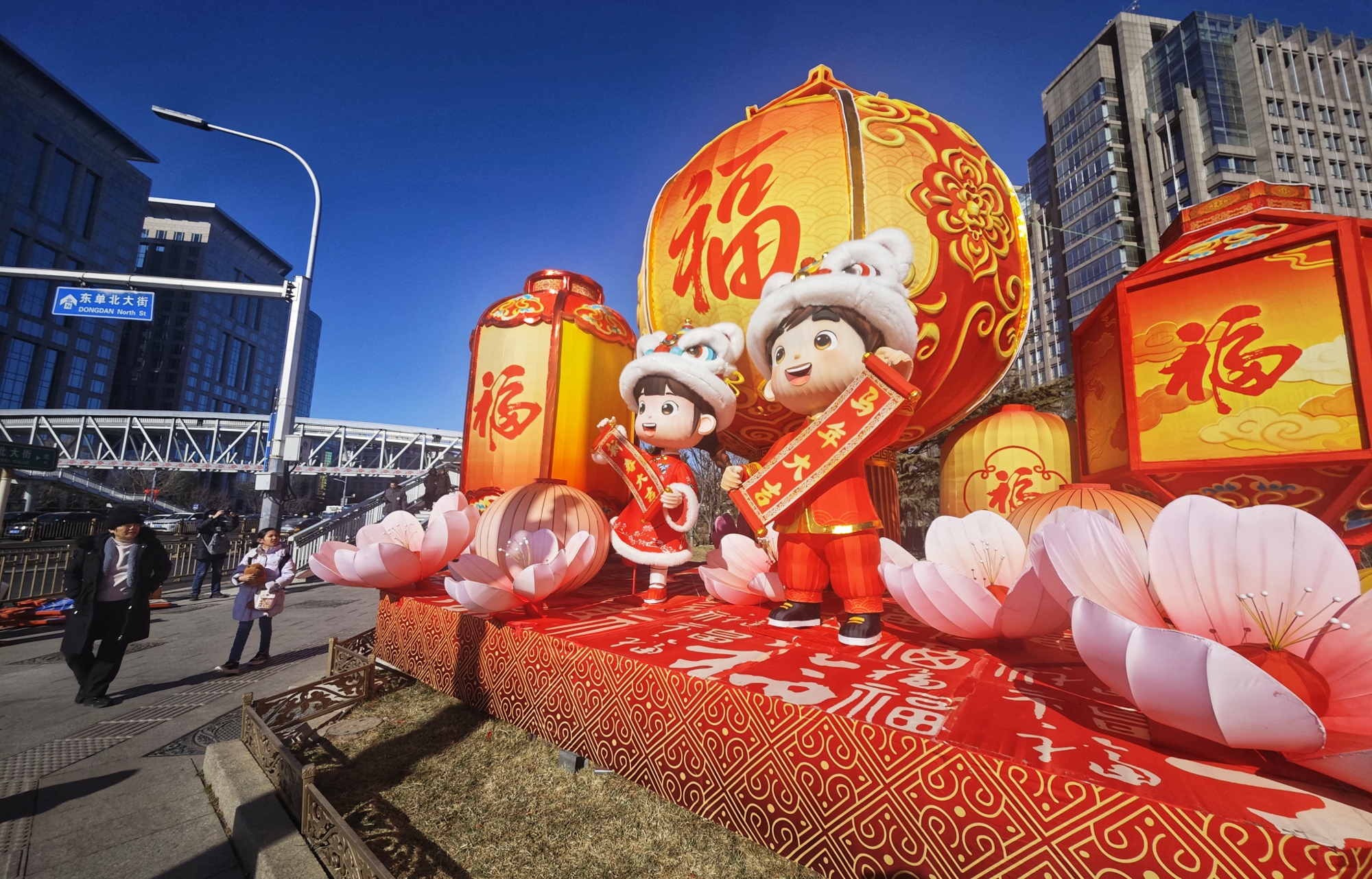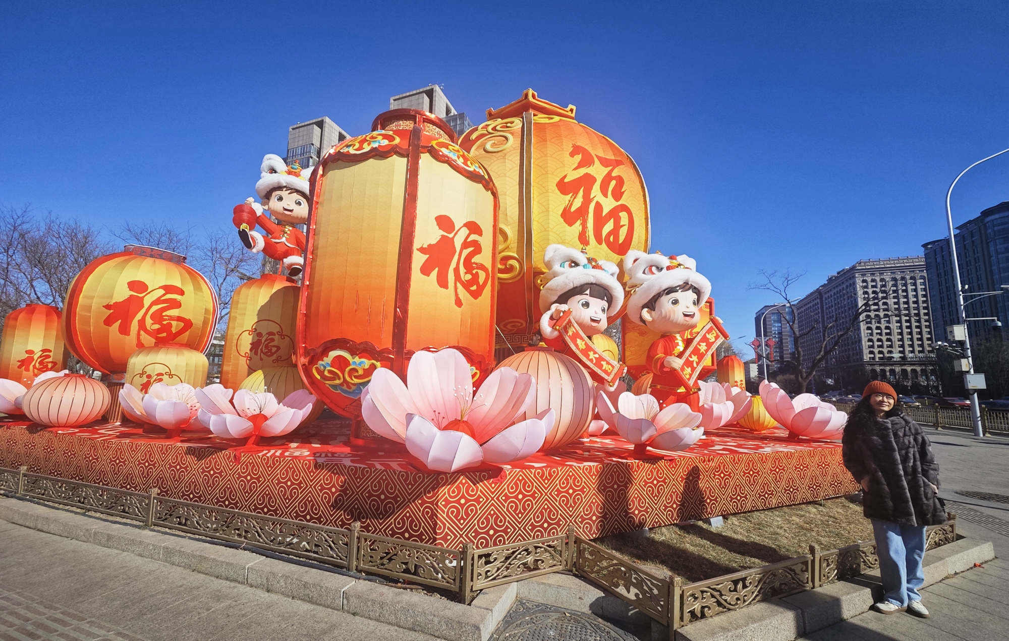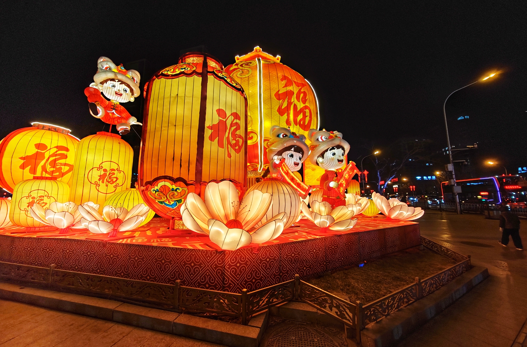 东单路口的“千福入户”主题灯景高达6米,巨型“福”灯为视觉核心,童趣福娃、缤纷花饰与错落灯组相映成趣,红金主调尽显喜庆祥和,灯景深度诠释“福气盈门、万家祥和”的美好寓意,既彰显“家”的温馨盛景,又通过传统年俗元素的创新呈现,传递幸福满溢的新春愿景。