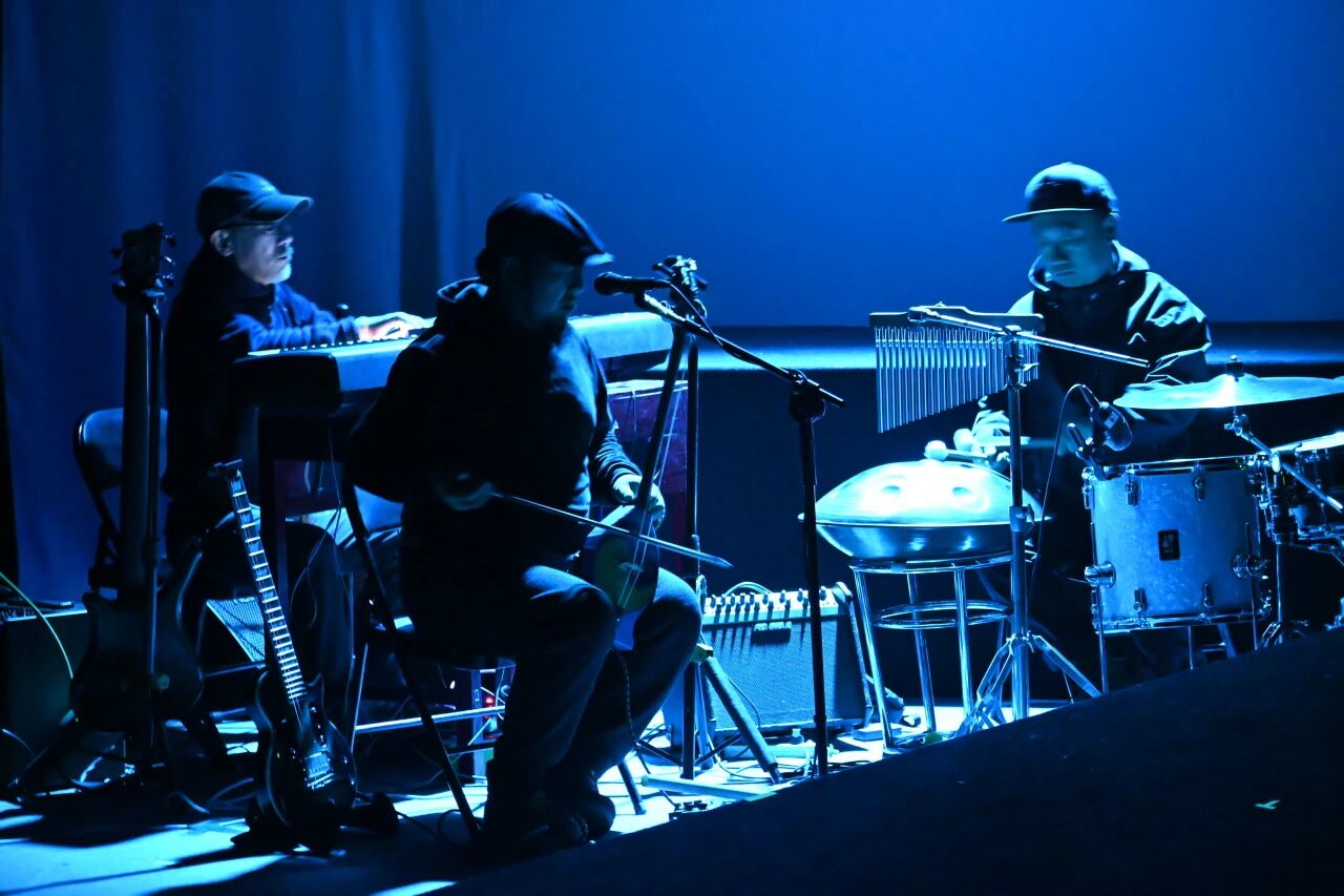 该剧最令人耳目一新的,是颠覆了传统戏剧中音乐的从属地位。演出一开始,现场乐队的表演就瞬间铺展开辽阔的土地气息与深沉的时代回响。来自胡格乐队的三位乐手,将呼麦、胡琴、电吉他、贝斯、架子鼓、马头琴、手碟等融入戏剧结构之中,音乐不再是背景烘托,而成为直接参与叙事、塑造人物的“另一重表演”。乐队用不同的乐器音色对应不同角色,并在既定框架下进行即兴演绎,与台上演员的台词、动作、情绪在同一物理时空里实时共振。