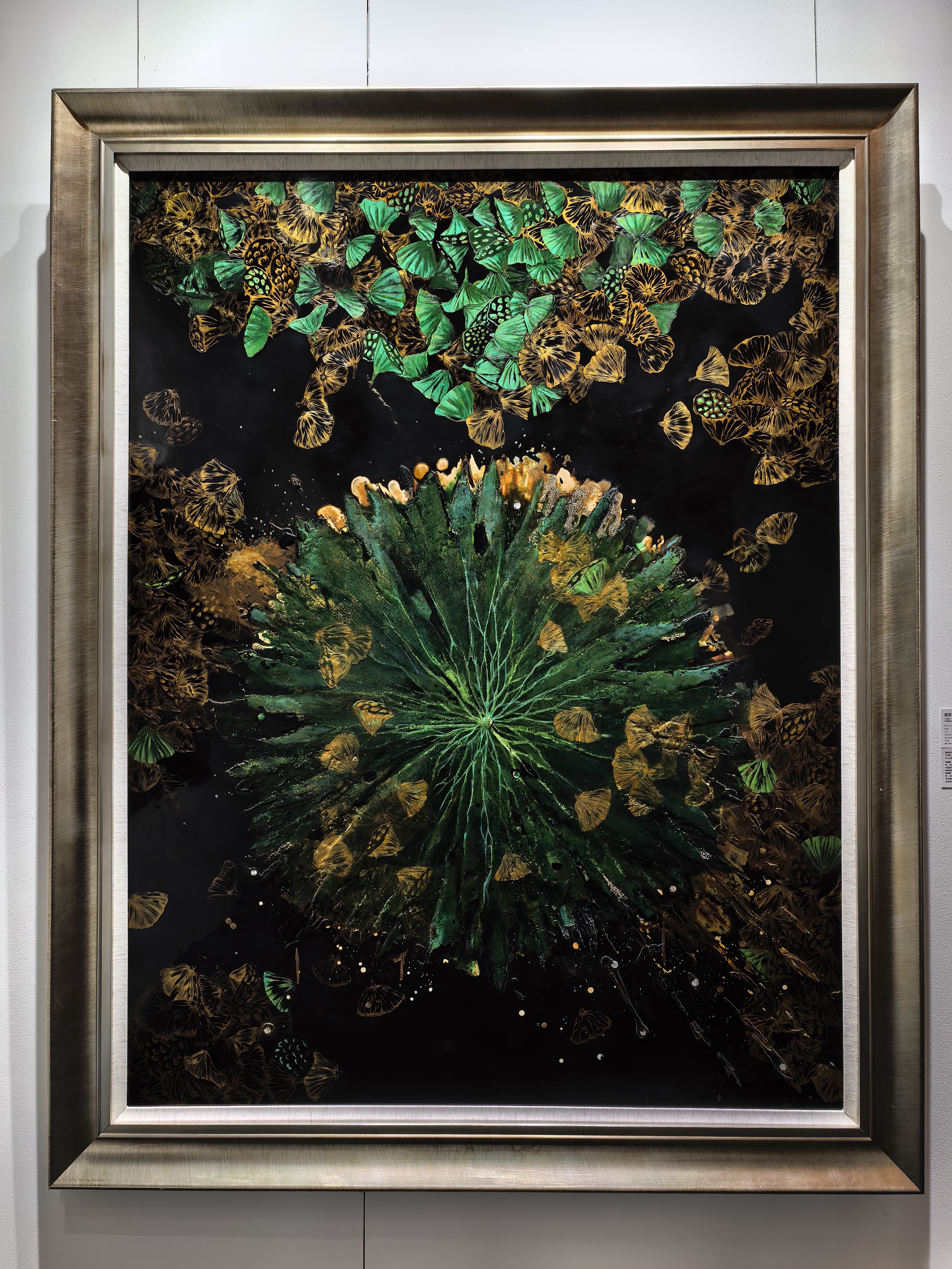 而当目光转向那幅以蝴蝶与荷叶为主题的作品时,仿佛置身于一片静谧的荷塘之畔。绿色的荷叶在黑色背景的衬托下,如同一把把撑开的绿伞,充满生机与张力。金黄色的蝴蝶翩翩飞舞,似是从画中飞出,给画面增添了一份灵动与梦幻。大漆在这里展现出了它细腻而温婉的一面,通过巧妙的色彩运用和精湛的工艺技法,营造出一种空灵、唯美的意境。这让我联想到中国传统美学中对自然、对生命的赞美与敬畏,大漆艺术以其独特的方式,将这份情感传承至今,并在当代艺术语境中焕发出新的光彩。