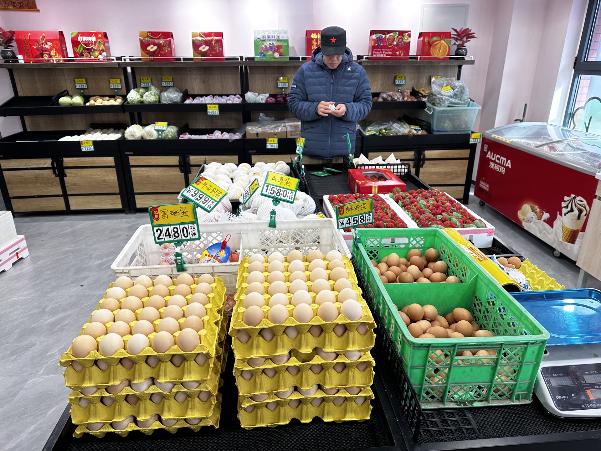 走进这座全新的邻里中心,两层约1600平方米的空间内,设计了丰富的功能场景。西侧紧邻社区的生活超市已率先试营业,货架上肉蛋果蔬、米面粮油十分齐全,为了春节供应稳定,老板特意提前进行了充足备货,每天还拿出如鸡蛋等单品做特价促销,刚开业就得到了大伙的认可。