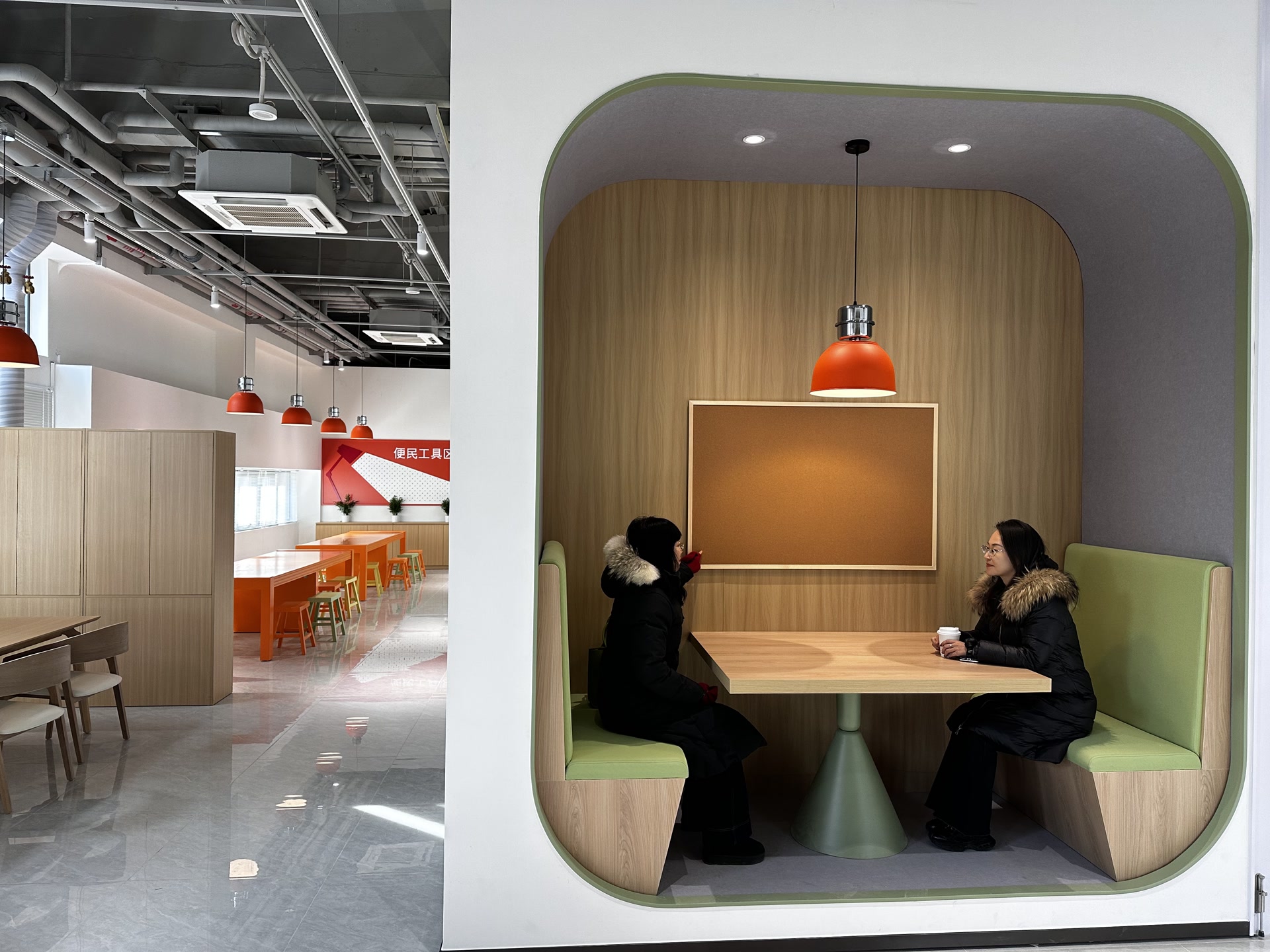 作为一个城市更新项目,龙泽邻里中心充分利用原储煤场约10米的挑高空间,在二层打造了有温度的社区共享空间,包含党群服务中心、社区活动室、儿童乐园、龙泽咖啡、手工制作区、共享自习室等。室内还特别设计了可推拉移动的模块化办公空间,打造灵活多变的活动场景,实现全时段空间高效复合利用。