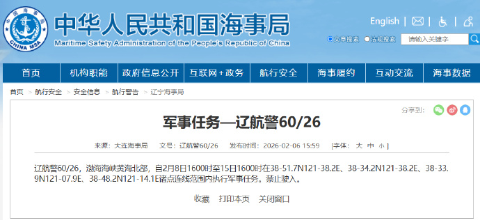 据中国海事局网站消息,大连海事局发布航行警告,2月8日16时至15日16时,渤海海峡黄海北部部分海域执行军事任务,禁止驶入。