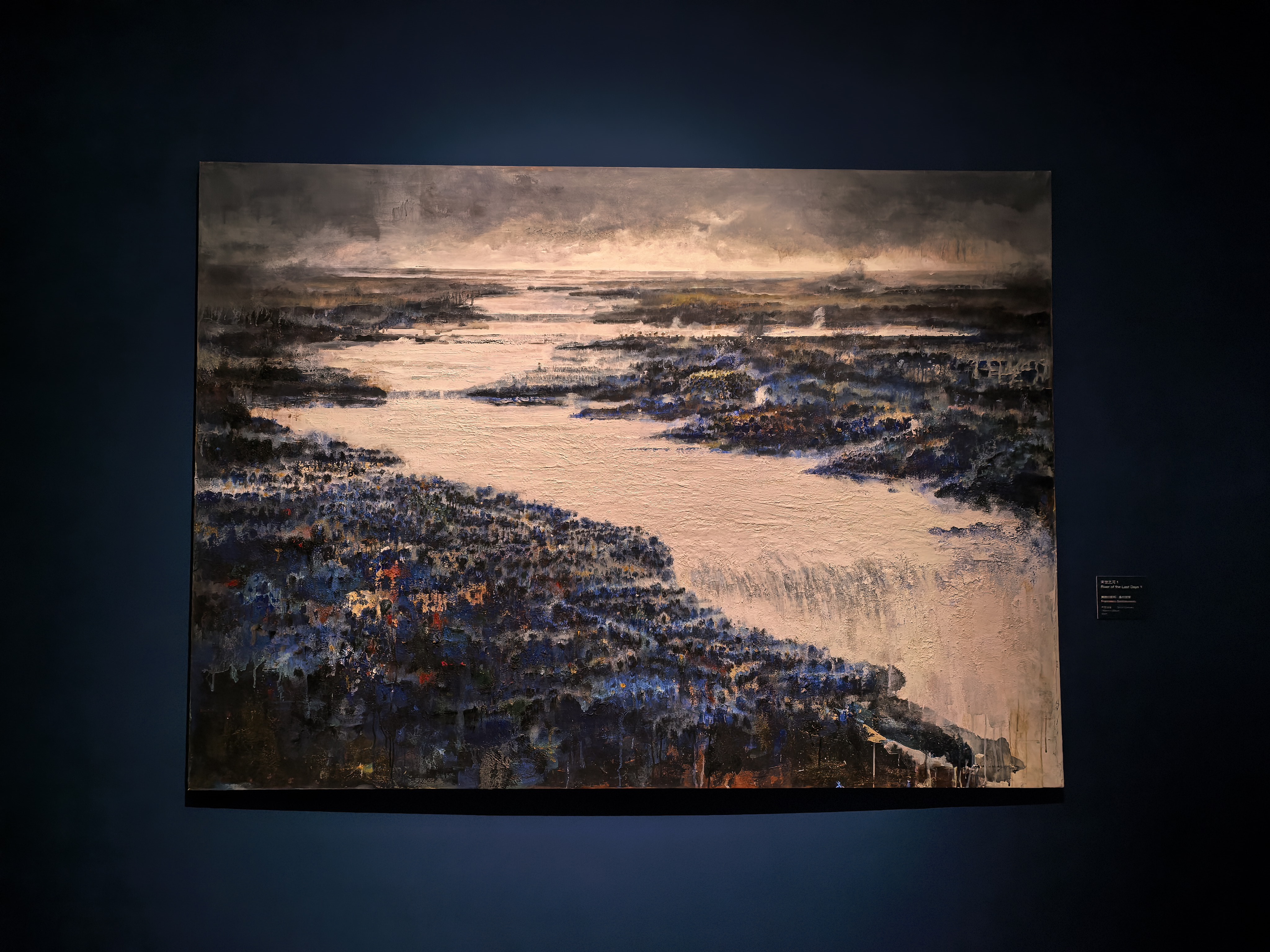 那幅以河流为主题的作品令我眼前一亮。画面中的河流蜿蜒曲折,错落有致,色彩斑斓而又和谐统一。桑托索索用他独特的艺术语言,将这片土地的神秘与魅力展现得淋漓尽致。仿佛能听见那河流的潺潺流水声,感受到大地的湿润与肥沃。