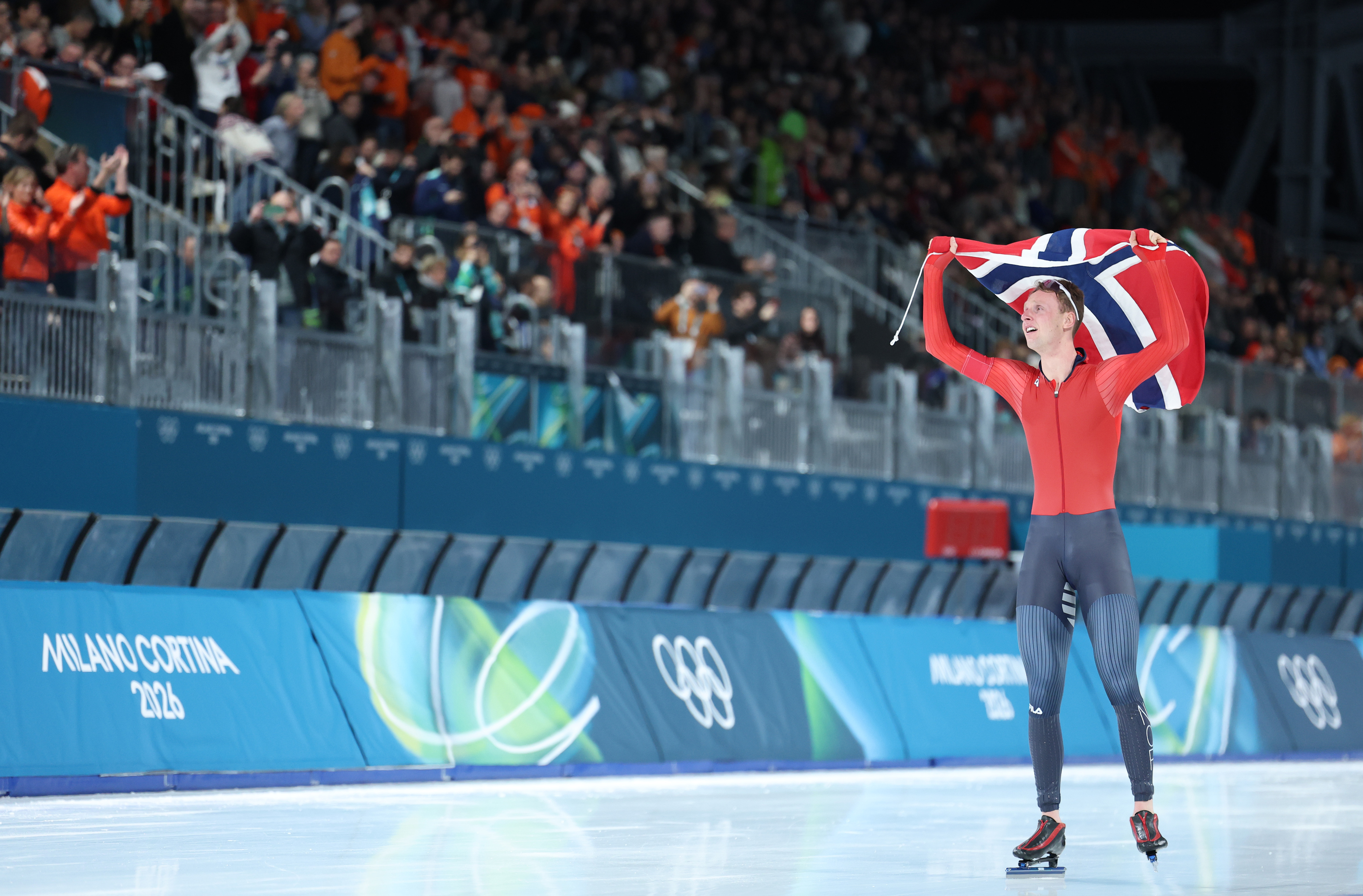 8日在米兰速滑馆进行的2026年米兰冬奥会速度滑冰男子5000米比赛中,来自挪威的世界纪录保持者桑德尔·艾特雷姆以打破奥运纪录的成绩夺冠,拿下个人首枚奥运金牌。