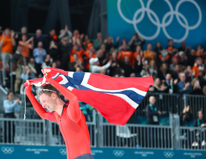 速度滑冰赛场,来自挪威的世界纪录保持者桑德尔·艾特雷姆展现实力优势,以打破奥运纪录的成绩夺冠,拿下个人首枚奥运金牌。中国选手刘瀚彬排名第17位。