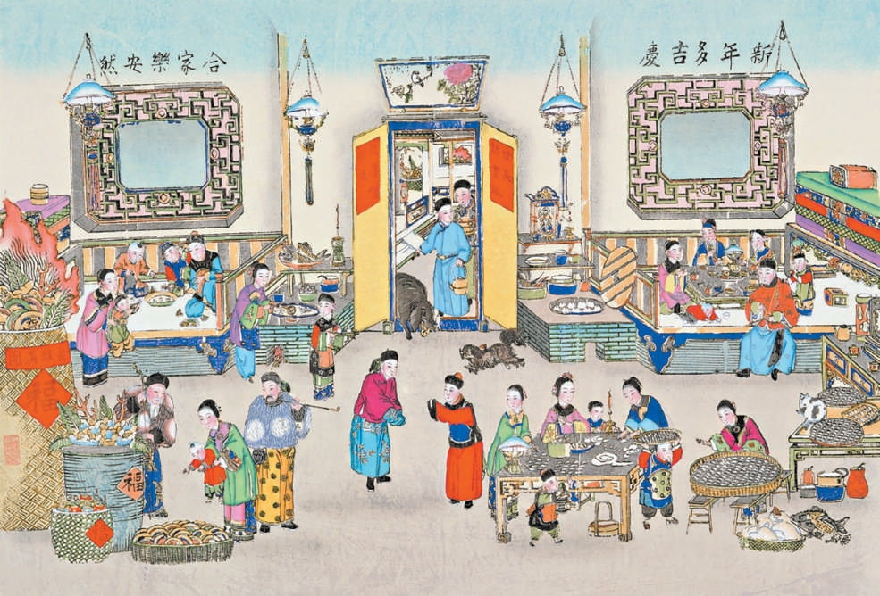 冯骥才认为,我们传统的年是一种生活节日,支撑它的是传统民俗。民俗是一种亲和又美好的生活文化和生活情感。它是一种朴素的“仪式”,不像宗教仪式那样严格规范,却由衷地发自内心。它最重要的不是形式,而是精神内涵和情感内涵。我们传统的年俗并非可有可无,而是讲究很严格的程序。比如在年的筹备上就有一整套要求。再比如,过去吃年夜饭之前必须祭祖,祭拜“天地君亲师”,以焚香磕头的方式,向大自然、祖先、师长以及生命的传延表达感恩与敬畏之情。“祭祖之后是阖家团圆,今天我们把它看作是一顿团圆饭,其实没那么简单。一个家庭一年一度地把家庭的人气凝聚起来,和谐相助,这也是我们中国人最看重的。而且这种以家族为单位的凝聚实际上是我们这个民族凝聚力的根本。这时,全家人又不由自主地都会说上一些吉祥话,相互助兴,特别是让老人高兴。春节时,老人一定要放在‘最上面’的位置,桌上最好吃的菜要先夹到老人碗里,这种意识一年年早已深入到我们的骨头里。”