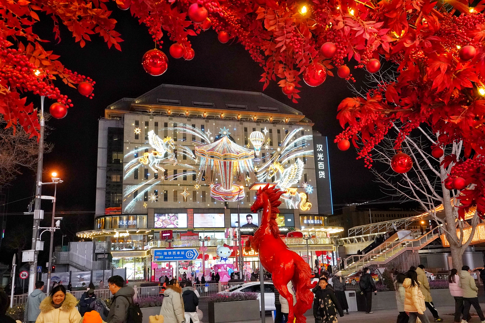 新春佳节将至,北京西单商圈年味渐浓,成为市民打卡迎新的热门地。街头矗立的红色骏马雕塑昂首扬蹄,与满树红花、璀璨灯饰相映,尽显“马到成功”的吉祥寓意。汉光百货外墙上,梦幻的灯光装置勾勒出旋转木马与飞马图案,搭配暖橙色连廊灯光,营造出沉浸式节日氛围。