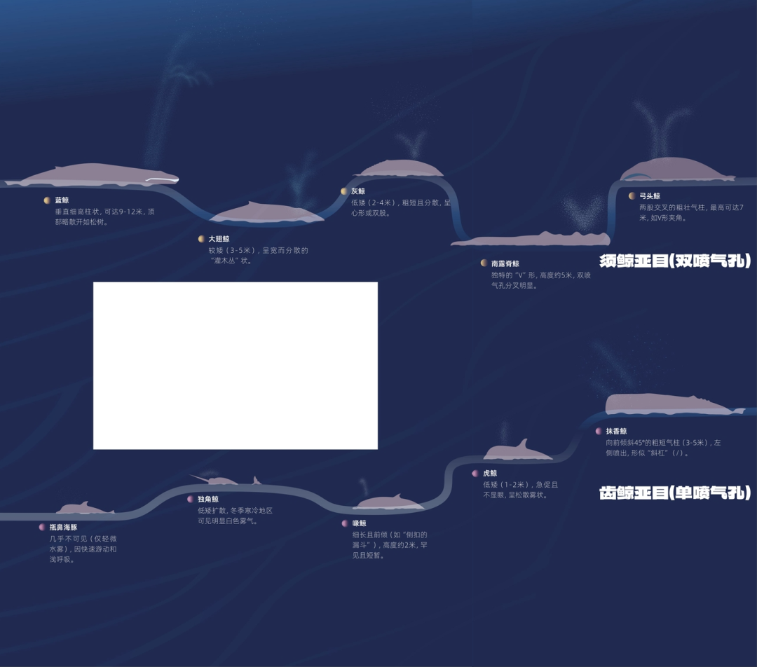 须鲸有两个喷气孔,齿鲸只有一个,这直接决定了气柱是“单股”还是“双股/V形”。