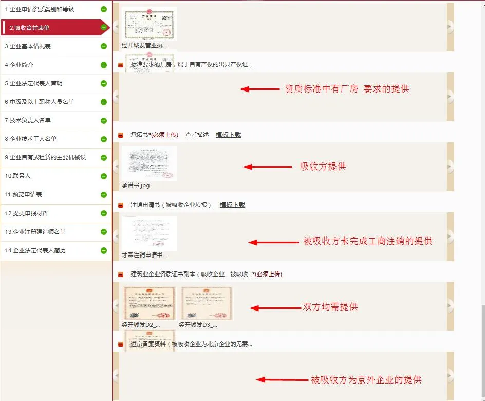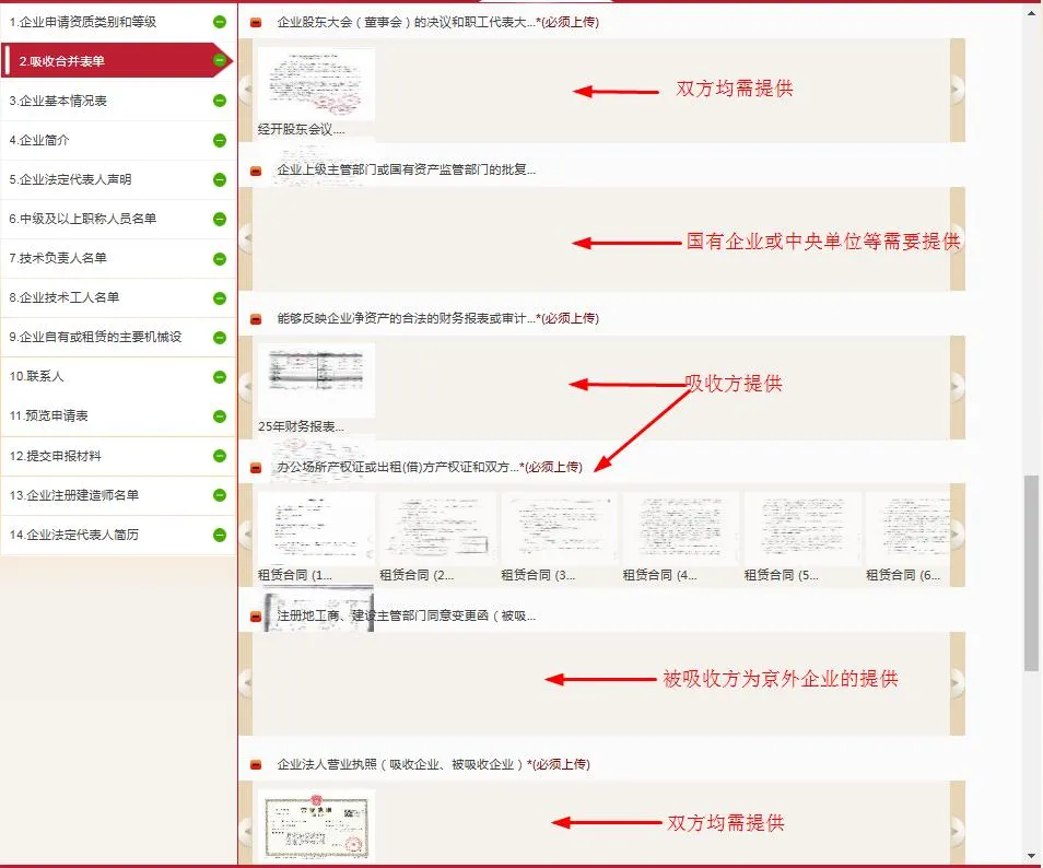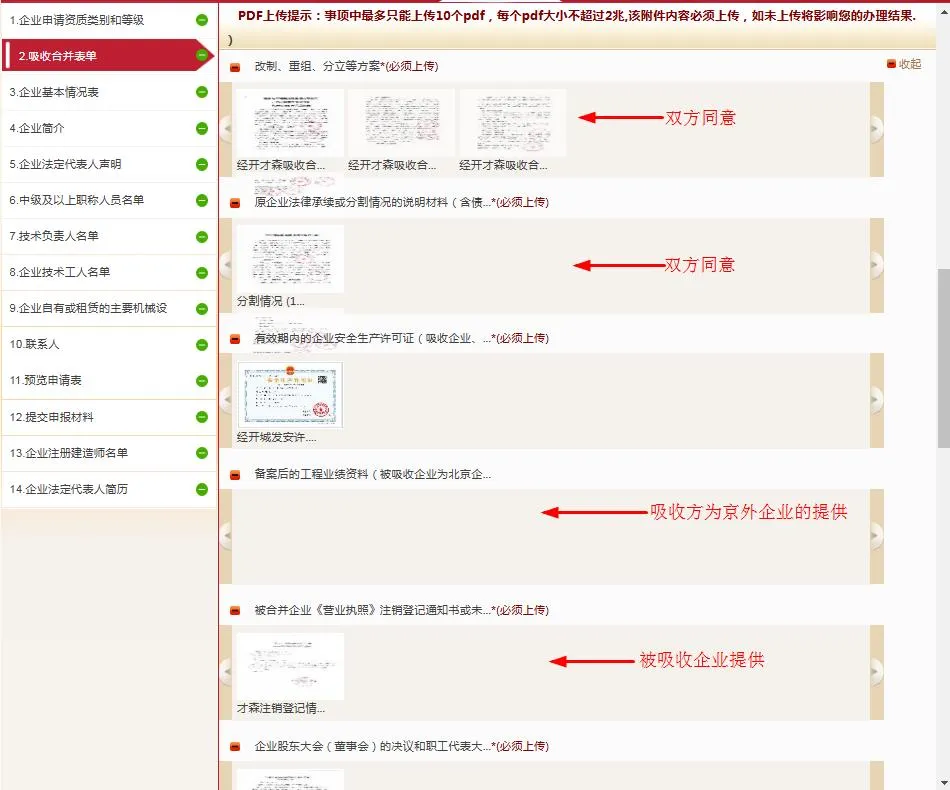 (2)“吸收合并表单”的下方,可上传企业的申请材料。