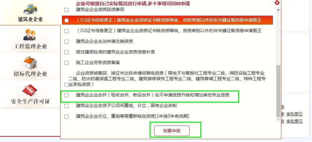 在“我要申报”界面,依次选择“建筑业企业”-从事项列表勾选“建筑业企业合并(吸收合并、新设合并)后不申请资质升级和增加其他专业资质”并点击“我要申报”;