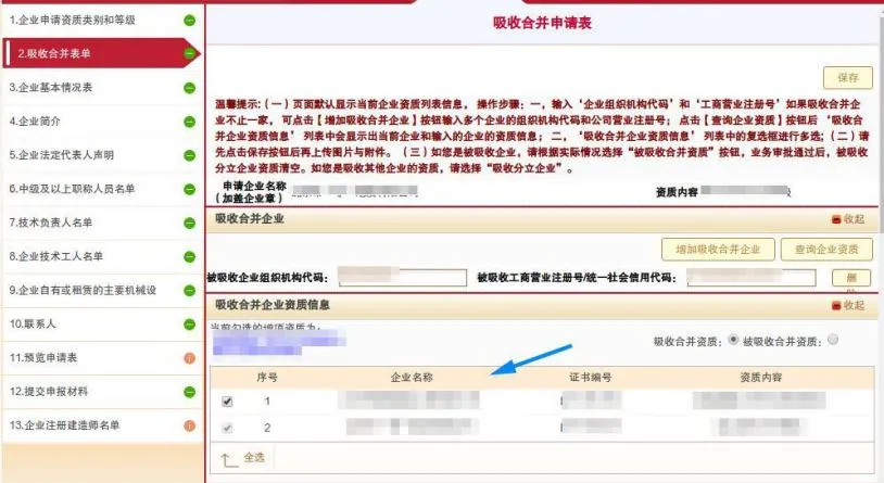 输入被吸收企业组织机构代码或者统一社会信用代码进行查询,查询后勾选吸收企业的全部资质类别和被吸收企业的拟被吸收资质类别。