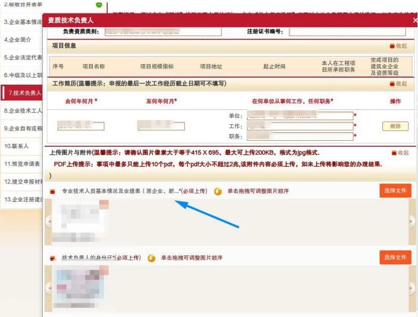 注意:技术负责人栏目需如实填写基本情况及业绩,并承诺真实。在专业技术人员基本情况及业绩表一栏,上传技术负责人职称证、毕业证、注册证和承诺内容,承诺内容需法定代表人、技术负责人签字,加盖企业公章。