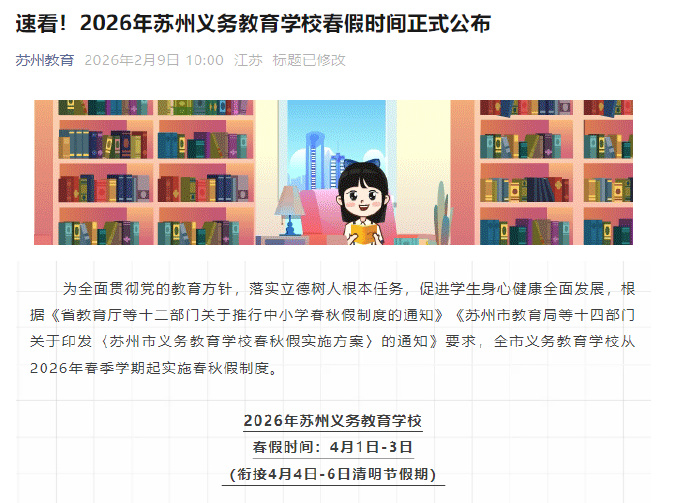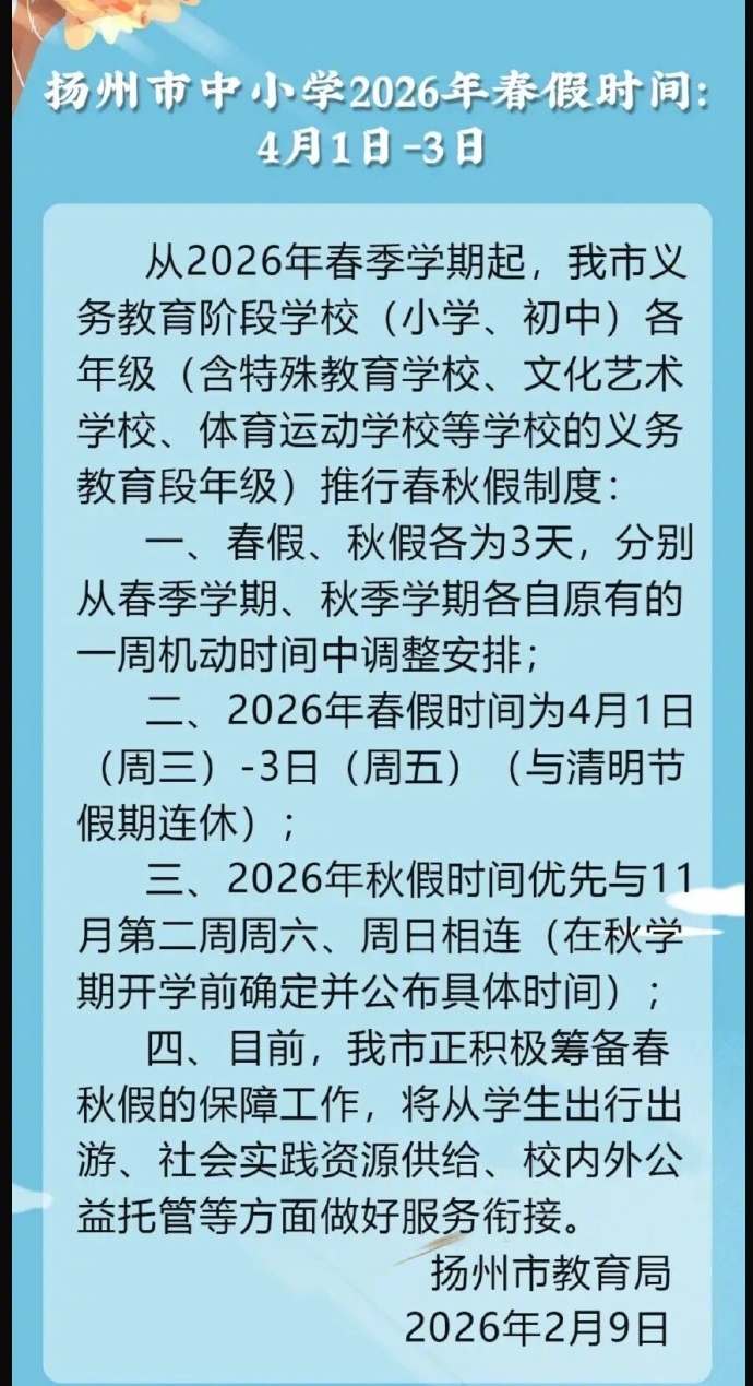 2月9日,南京各区、苏州、扬州发布中小学春假安排!根据相关通知,春假具体时间为在4月1日至4月3日,与清明假期(4月4日、5日、6日)相连。